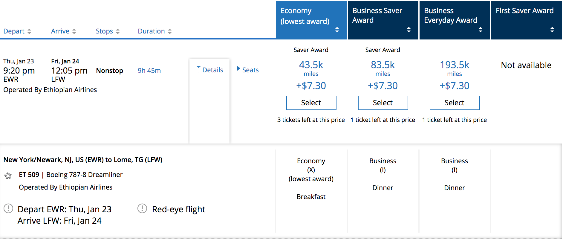 Economy awards on Star Alliance partners from cities like Houston (IAH), Washington (IAD) and Newark (EWR) to cities like Lomé (LFW), Accra (ACC) and Monrovia (ROB) start at just 40,000 United miles one-way. You can fly direct on some routes on Ethiopian Airlines or connect in Europe on airlines like Lufthansa or Brussels. Business saver awards start at 80,000 miles. If you're coming from a smaller city, watch out for multi-connection and long-layover itineraries. One route I checked out while reporting this story showed an itinerary with three stops for a total journey of over 40 hours.