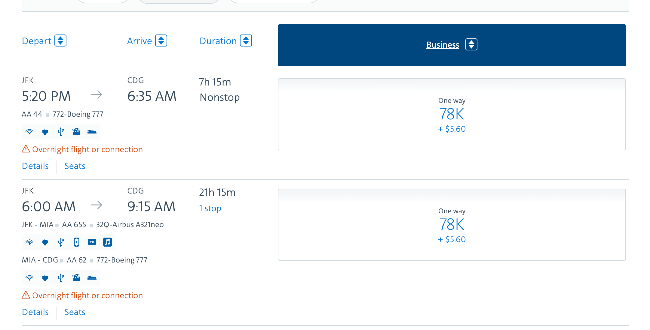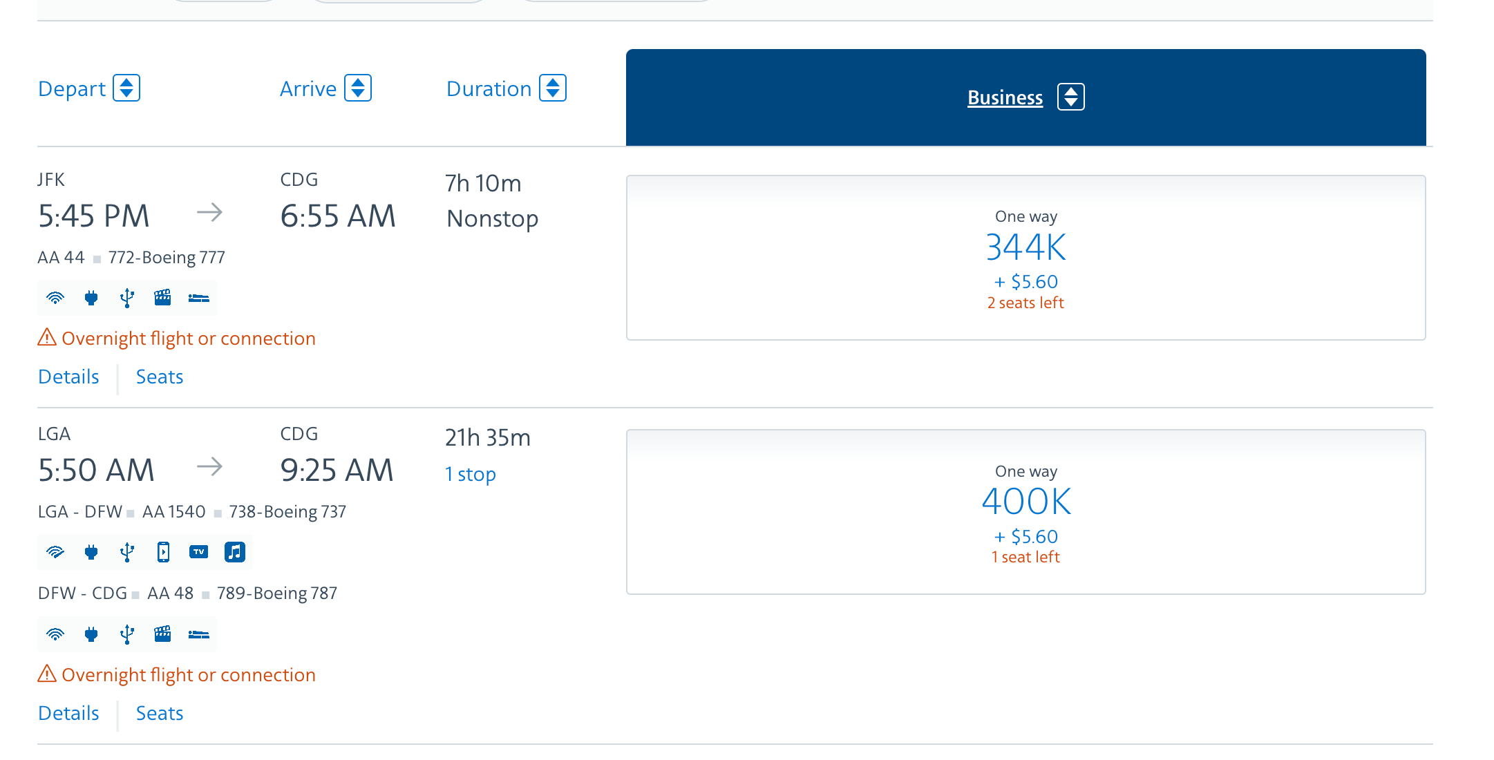 During the northern winter months, when there is less demand for flights to Europe, you can book business-class flights to Paris-Charles de Galle Airport (CDG) for just 78,000 AAdvantage miles each way, which is a solid deal.