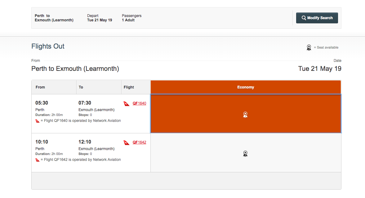 Learmonth - Perth | Qantas | Economy (one-class aircraft) | 7,500 (9,000) |