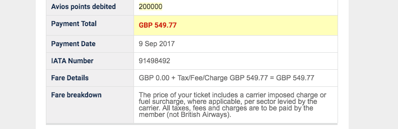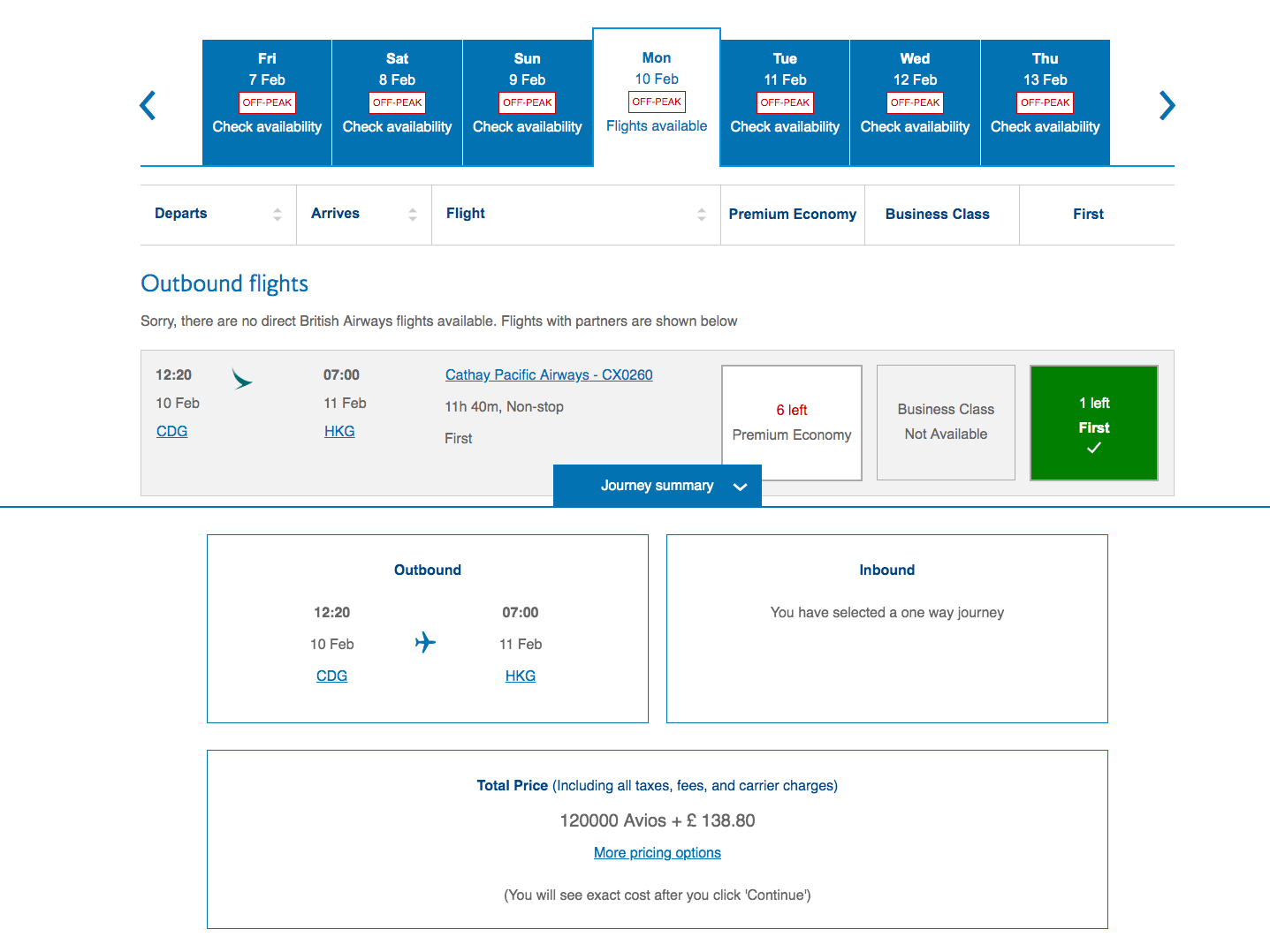 As this shows, the savings in Avios is significant at 200,000 for the Multi-Carrier Award vs 336,000 if booked separately. Even if the ticket had priced at x3 for First Class (300,000 Avios), it still would have been cheaper to book this way.