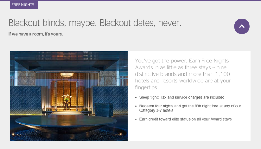 - When it comes to room upgrades using points, the "no blackout dates" policy tends to go out the window, as most hotels can restrict those rooms as they see fit.