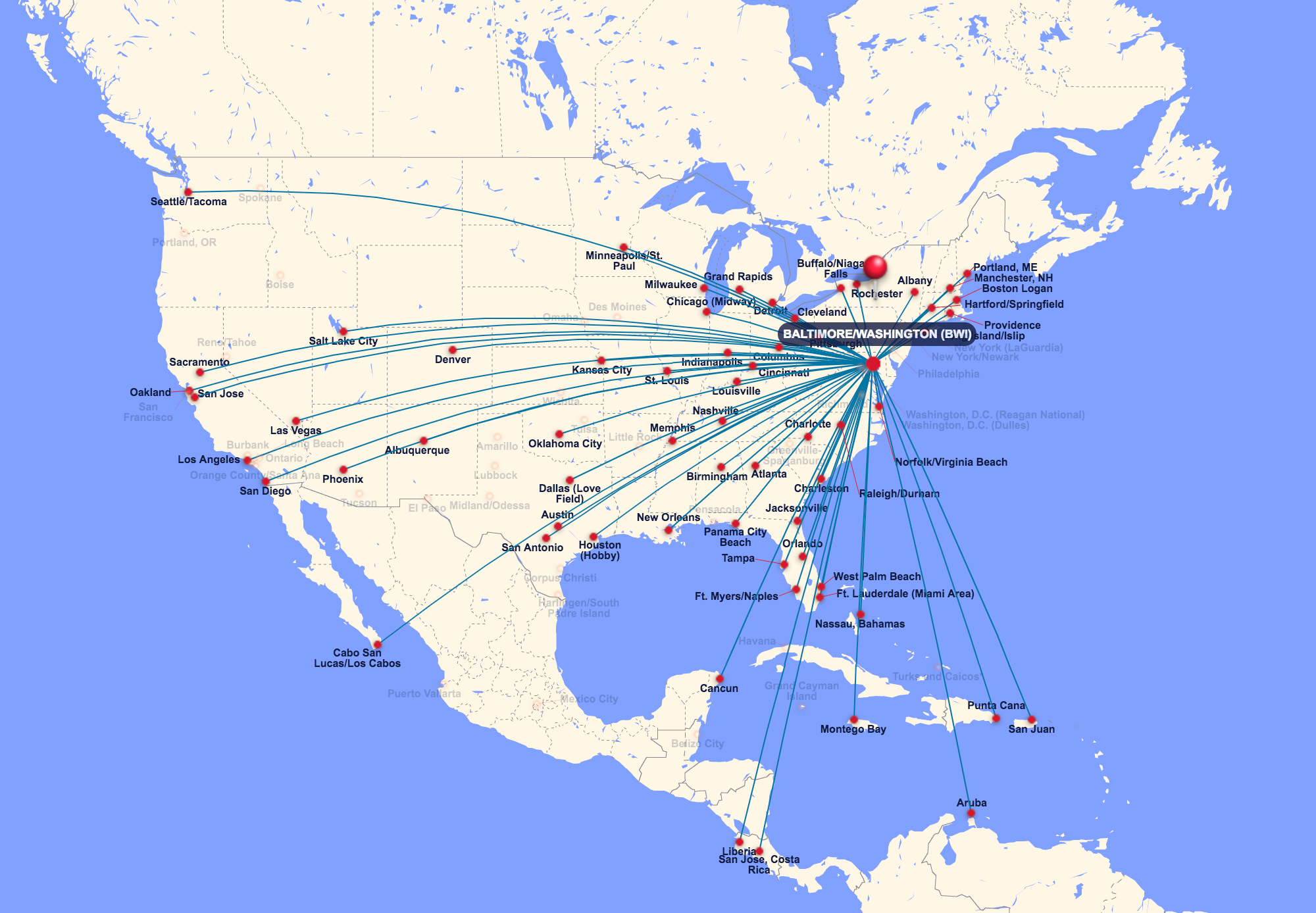 You can fly all over the US, the Caribbean and Central America out of Baltimore-Washington (BWI), but if your DC-area digs are in Northern Virginia, that could make for an inconvenient travel.