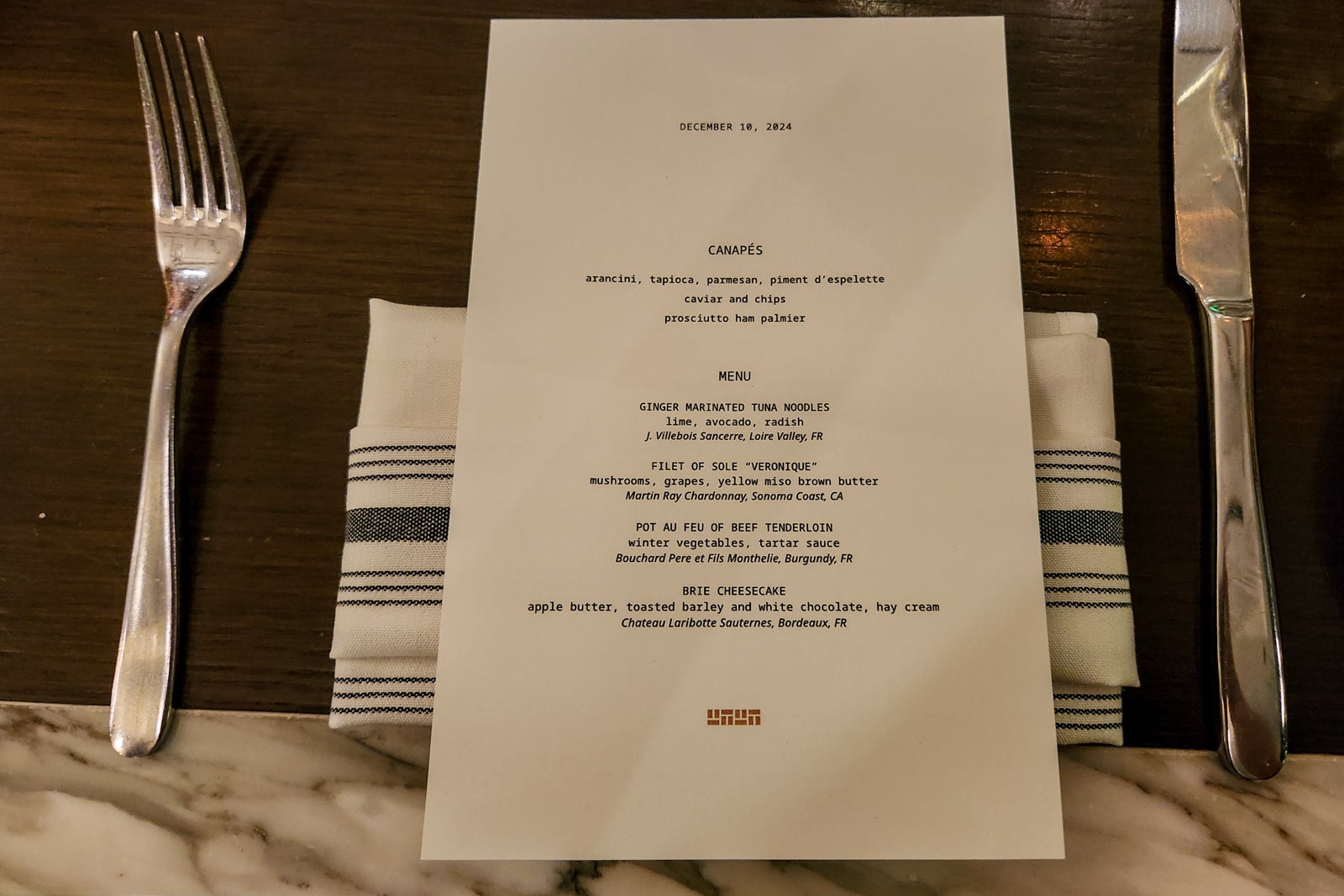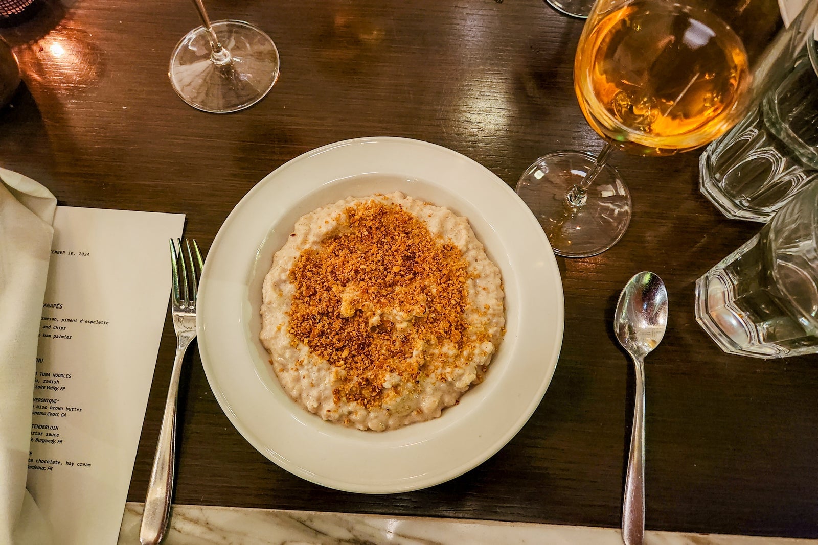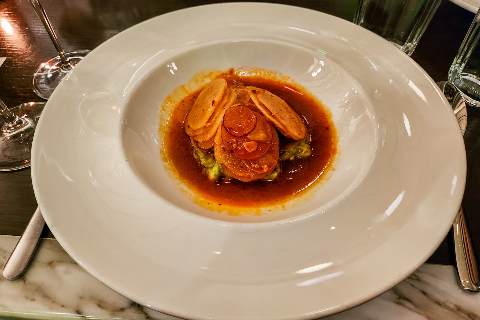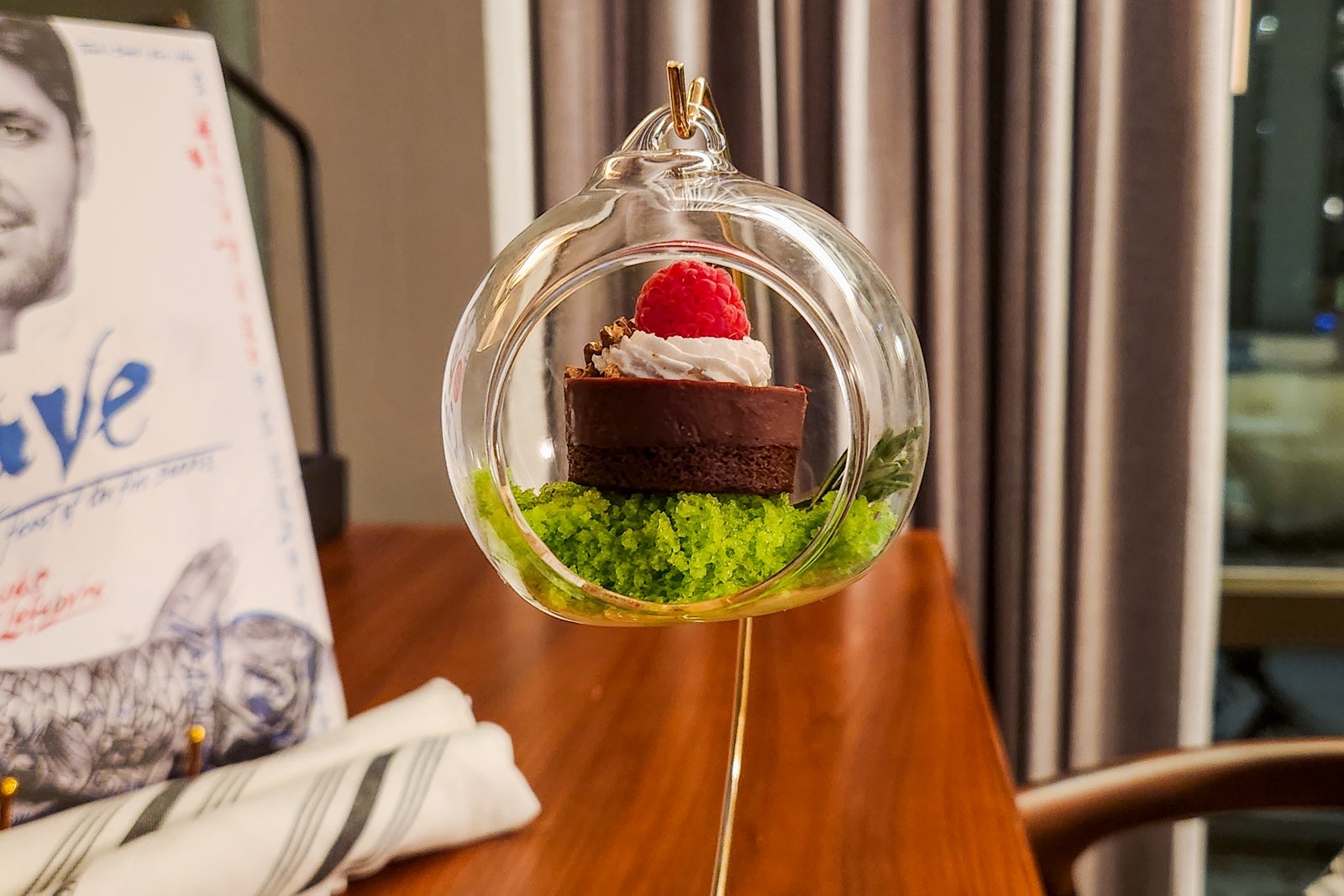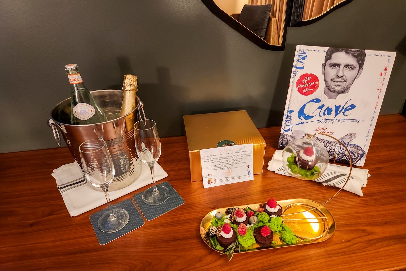 My experience also included several goodies waiting for me in my room: a signed copy of the chef's recipe book, a box of three of his favorite spice blends, a Thompson water bottle, sparkling wine and mineral water on ice, and house-made ganache bites (made specially vegan for me).