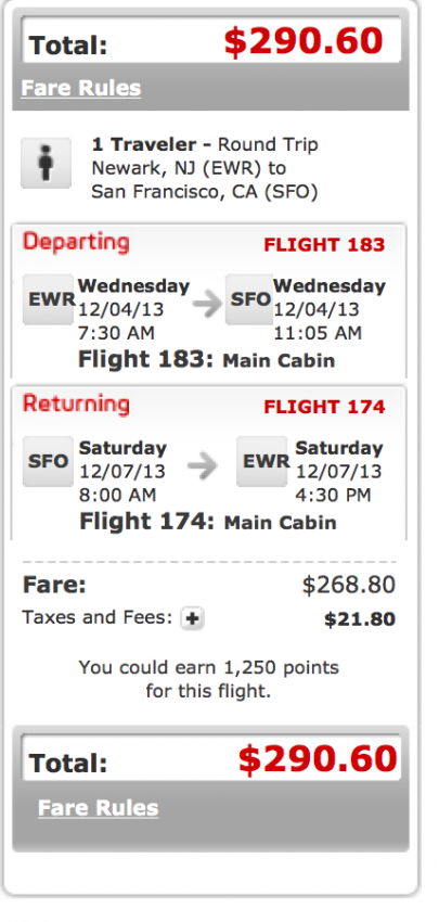 I priced this out on a Wednesday-Saturday Newark to San Francisco booking for December 4-7, 2013. Without the code the fare was $357.80- but with GETDOWN it dropped to $290.60.