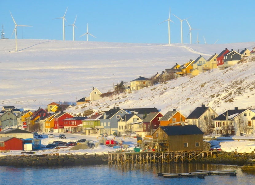 Beautifully colored houses set off the stark white polar landscape in Honningsvåg, along with eco-friendly windmills.