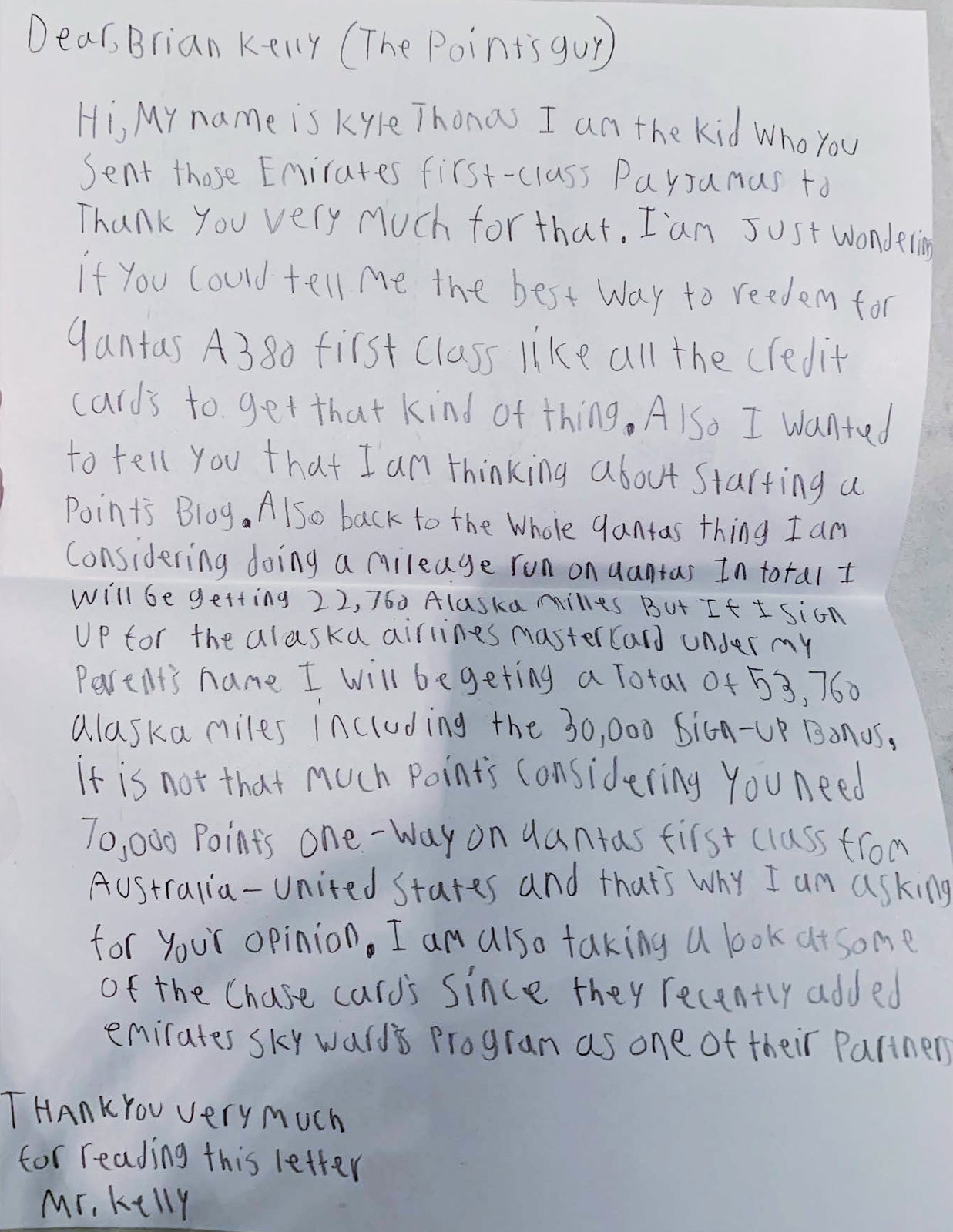 When 10-year-old Kyle Thomas wrote his holiday letter, he didn't ask for a gift card or a new Nintendo DS. He asked Brian Kelly, The Points Guy himself, how to redeem miles to fly in first class on the Qantas A380.