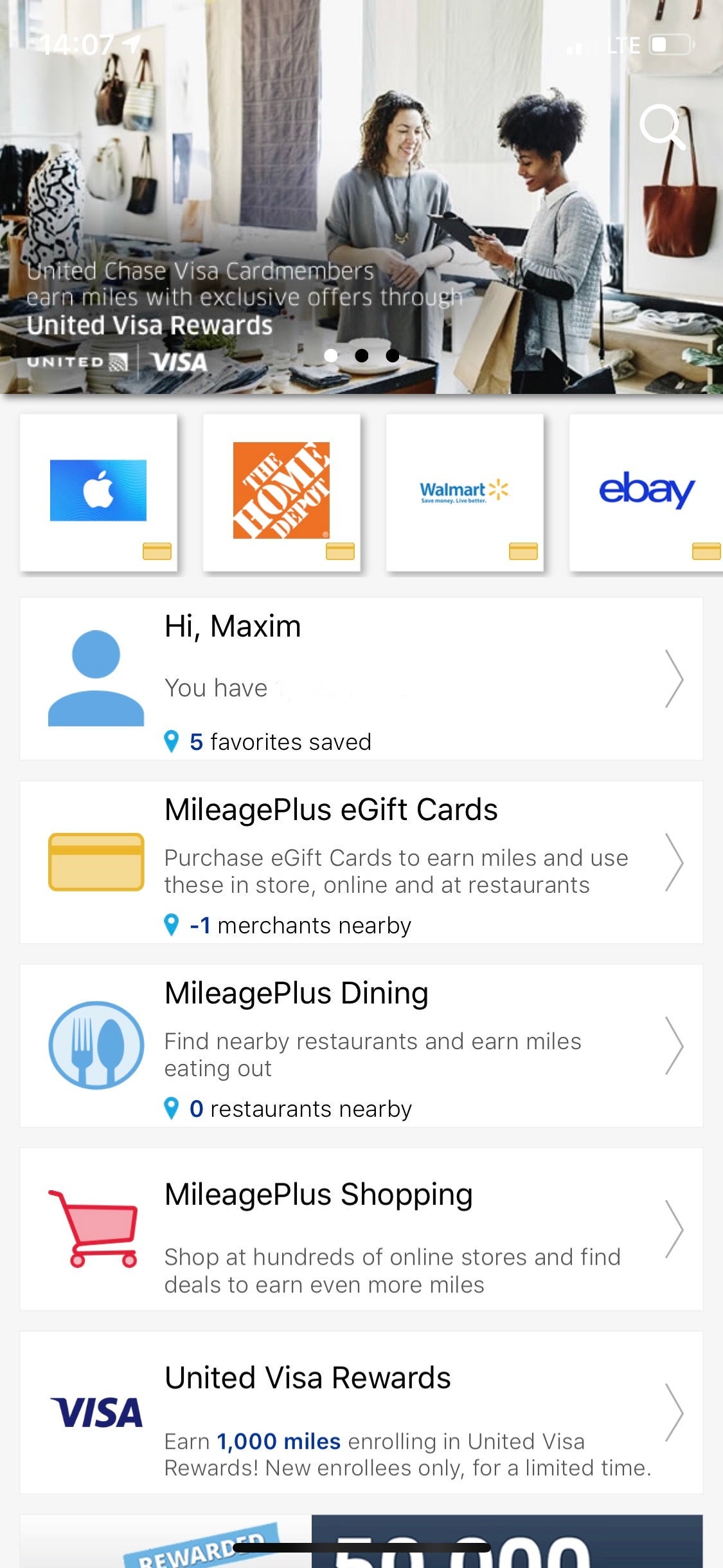 To link a credit card or debit card — in this case, your eligible United Chase Visa card — toggle down to the "United Visa Rewards" tab toward the bottom of the app. You could link your card using through the "My Account" section of the app, however, this could prevent you from properly enrolling in the United Chase Visa promotion.