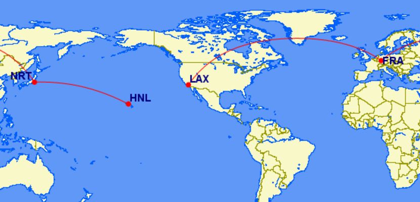 Fly from Los Angeles (LAX) to Frankfurt (FRA) on one of my favorite economy products: Lufthansa's A380. Make sure to grab seats on the upper deck for the best experience. While Frankfurt isn't the most exciting destination, many destinations in Europe are just a short train ride away. Then, head to a completely different world via a nonstop flight to Tokyo (NRT). After exploring Tokyo's treasures, head to the beach! ANA has a direct flight from NRT to Honolulu (HNL).