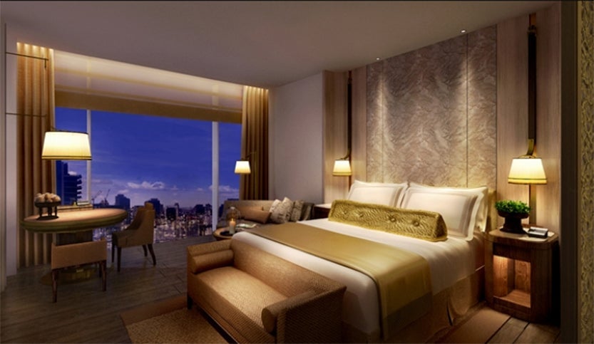 Guest rooms will start at over 500 square feet with floor-to-ceiling windows, amenities like 49-inch televisions and espresso machines, and a décor palette of gold accents reminiscent of the Thai royal palace's gilded roof.