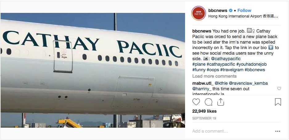 9. What the F?: It's one thing to make a typo. It's another when that typo is several feet high, as was the case with a misspelling in the livery of a Cathay Pacific jet which left out the "F" so that the airline name read "CATHAY PACIIC." At least the airline was able to make light of the situation with a Twitter post reading: "Oops this special livery won't last long! She's going back to the shop!" Wonder how much that cost to fix…