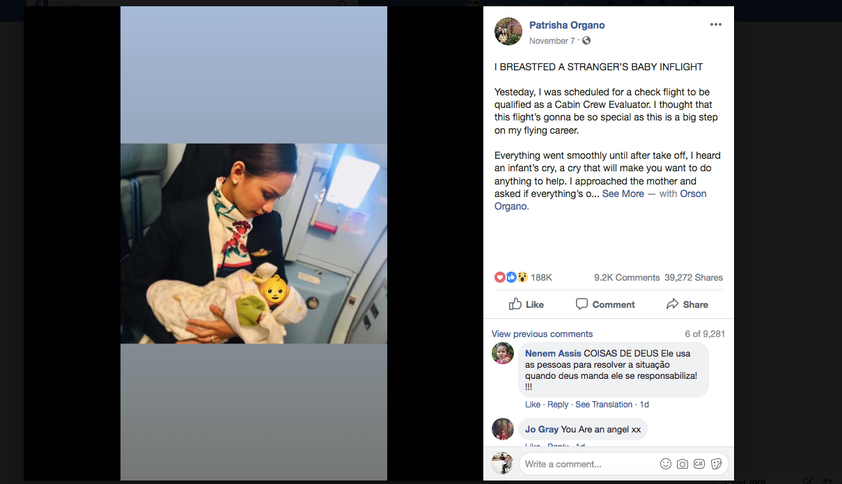 18. Flight Attendant To The Rescue: Well, maybe there is one other who would do the same. A story went viral in November about a Philippine Airlines flight on which a mother ran out of formula for her infant. Both the mother and her baby were clearly distressed. That's when a flight attendant stepped in to help. Patrisha Organo, who was a new mother herself and was onboard to complete her cabin crew evaluator certification, took the baby to the galley and nursed her until she fell asleep, proving once again that flight attendants are there for your safety and comfort.