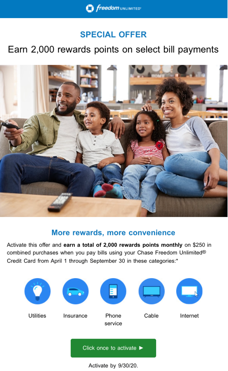 While 2,000 bonus points aren't earth-shattering, this is a nice way for Chase Freedom cardholders to earn even more points on spending on household bills that don't typically earn bonus points beyond the standard rate. Between the category bonuses offered by the Chase Freedom card this quarter and now this 2,000-point bonus from the Unlimited, you've got plenty of opportunities to maximize essential spending while in self-isolation.