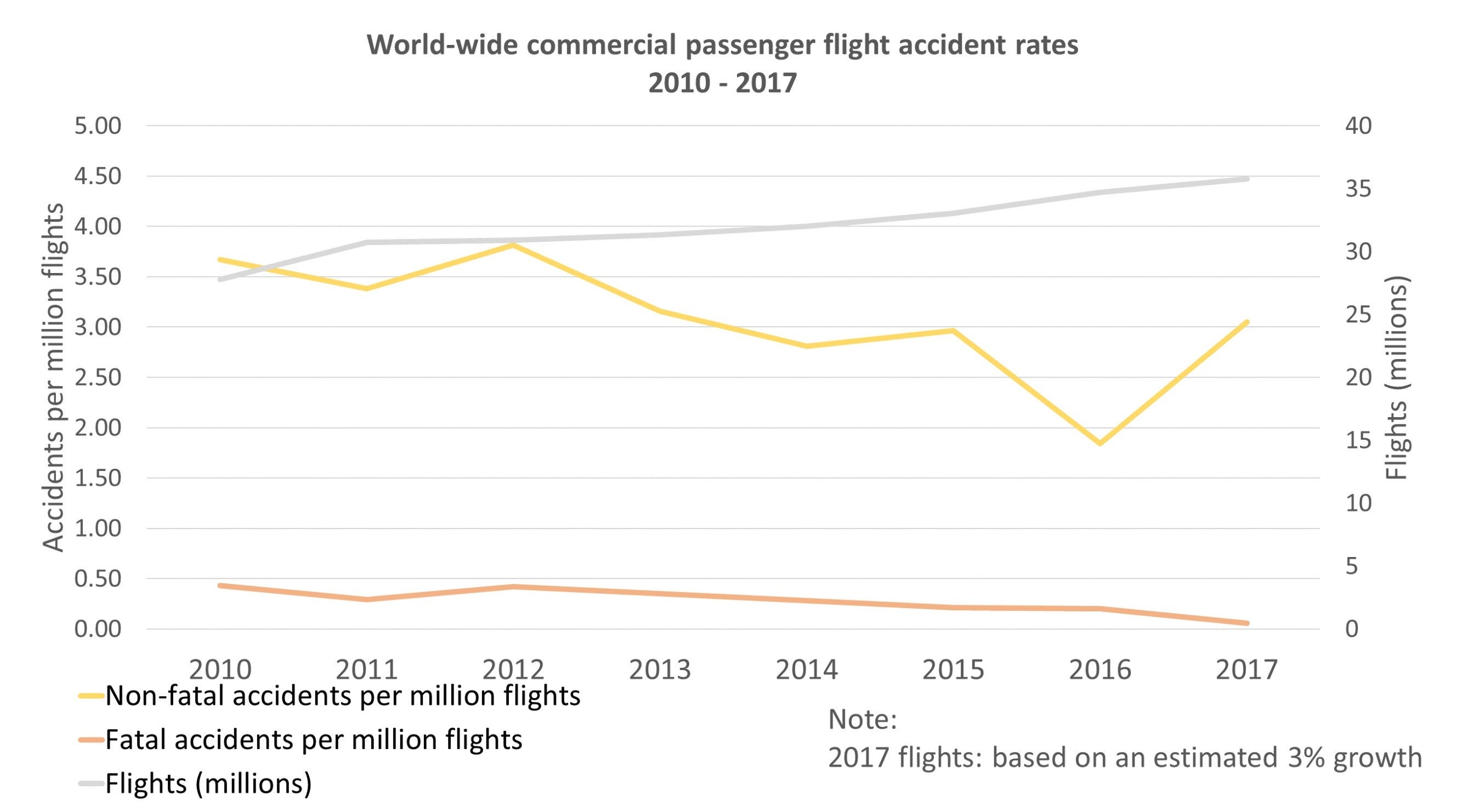 This exceptionally low number of fatal accidents calculates to 0.06 fatal accidents per million flights in 2017. Put another way, the chance of a commercial flight being involved in a fatal accident during 2017 was 1 in approximately 17 million.