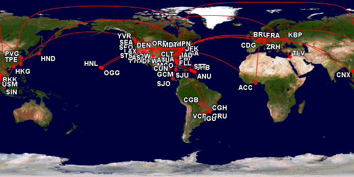 Unique airlines: 24 (Azul, Alaska, ANA, American Airlines, Bangkok Airways, British Airways, Brussels Airlines, Cape Air, Cathay Pacific, China Airlines, Delta, GOL, JAL, JetBlue, LATAM, Lufthansa, SilkAir, Silver Airways, Singapore Airlines, South African, Southwest, Swiss, Thai and United)