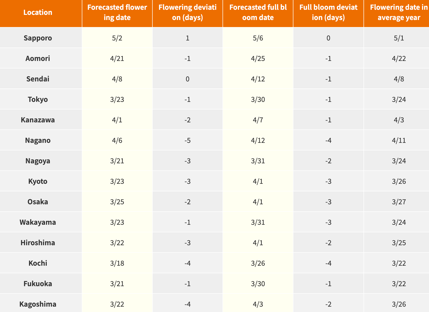 In Tokyo, for example, the forecasted flowering date is March 23, with full bloom expected seven days later on March 30. In Kyoto, the blooms are expected to become flowers on the same date as in Tokyo (March 23); full bloom is expected two days later than in Tokyo on April 1.