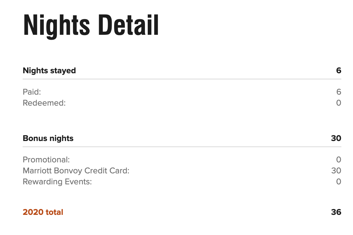 This morning, I logged into my Marriott account and was surprised to see my elite-night balance had jumped significantly overnight. It was at 21 nights earned for the year as of yesterday, but now the total stands at 36 nights. Intrigued, I dove into my account details and noticed that I now had 30 elite nights from credit cards.