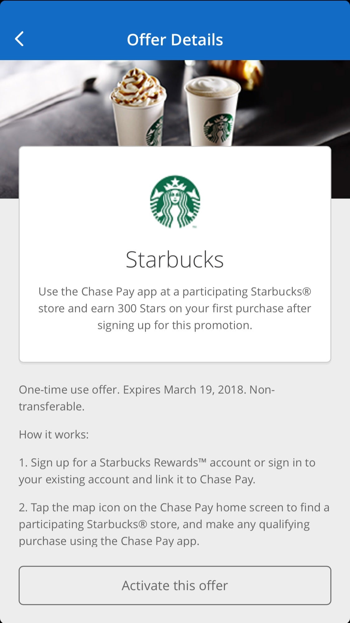 If you don't have Chase Pay, you can download the app in the app store. Use your Chase credentials to log in to the Chase Pay app, and then you'll see the Starbucks offer on the home page. You'll then click "Activate this offer," which will prompt you to sign in to your Starbucks account to complete registration. Then, you just have to use the app to make your Starbucks purchase. It's as simple as that for a complimentary caffeine buzz.