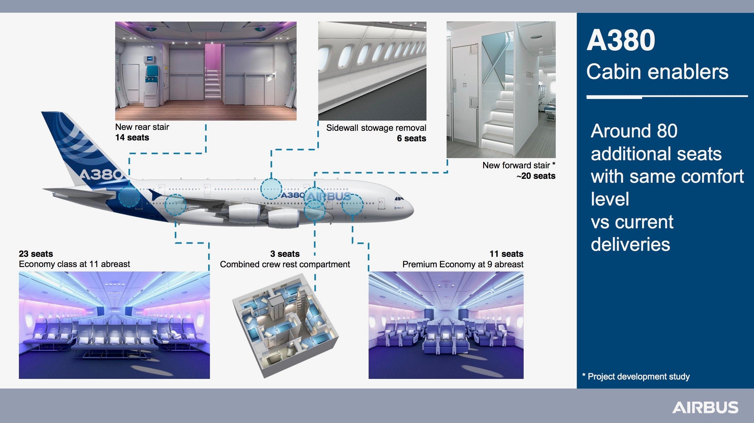 Airbus is calling this version of the A380 "NFS," for New Forward Stairs. Dr. Kiran Rao, EVP of Strategy and Marketing at Airbus Commercial Aircraft, said, "Continuous improvement of our products is our daily work. This new package for our A380 customers is a smart way to meet airline needs while improving the A380 economics with additional revenues and innovating in passenger comfort."