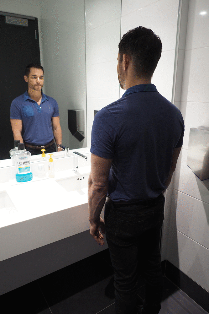 - With a giant breath, puff up your chest (to a ridiculous super hero type of shape)