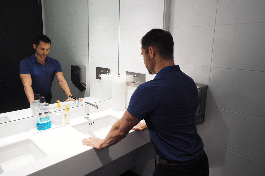 - Put your hands on the sink — germ-conscious folks can put down a paper towel first.