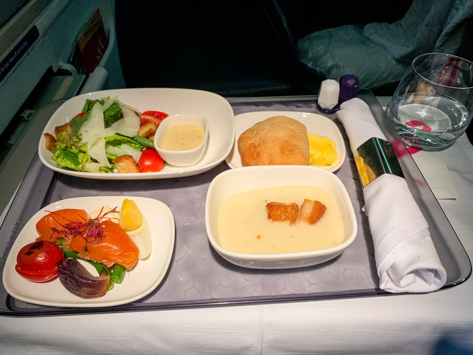 The three-course meal started with smoked salmon, a Caesar salad, potato and leek soup and warm bread.