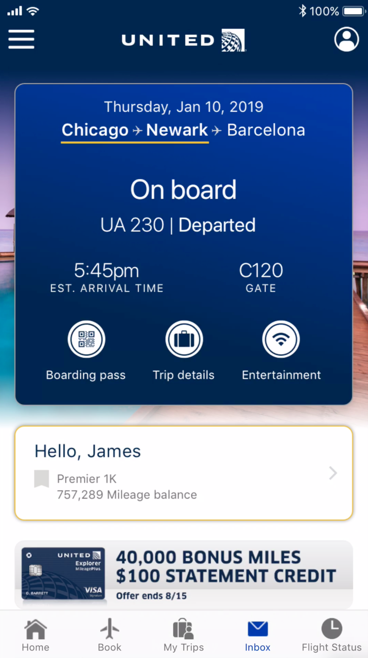You'll see a list of all upcoming United flights attached to your MileagePlus account, along with direct access to a boarding pass whenever you're already checked in. It feels much less clunky than the old sidebar tab.