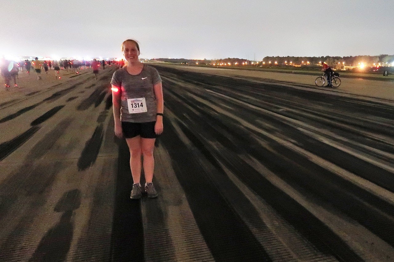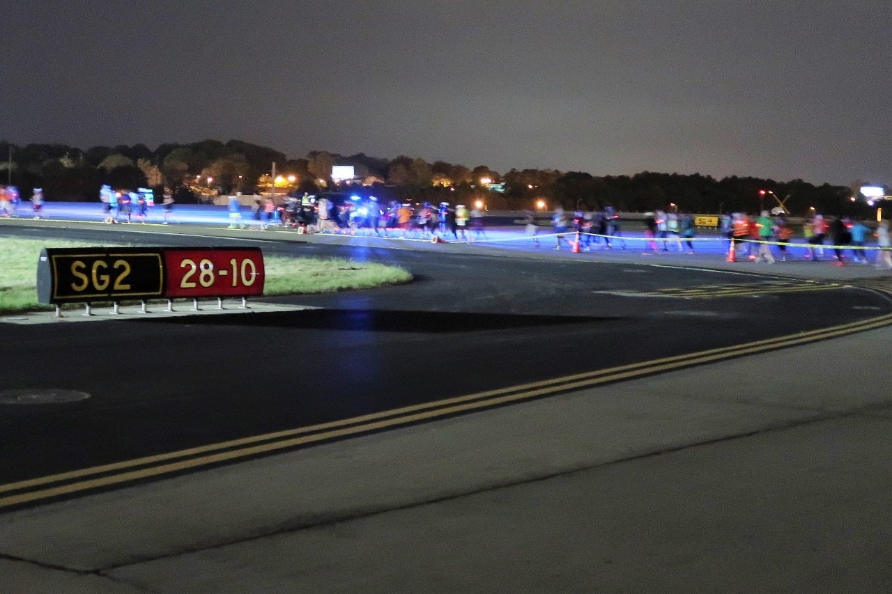 Since it was still dark when we took off, race organizers had set-up floodlights at certain critical turns, set up cones to avoid runners twisting their ankles on the taxiway drop-offs and issued each runner a flashing red armband. In the darkness of the predawn hour, the sea of blinking red lights was quite a mesmerizing sight.