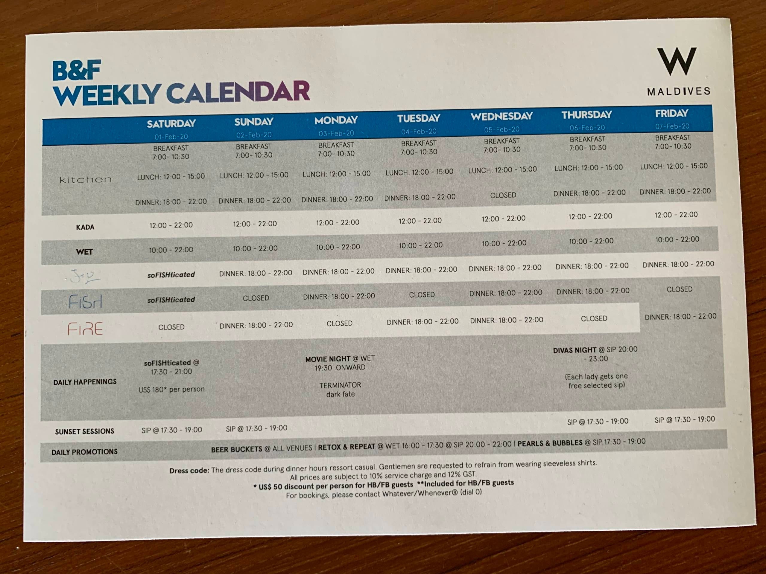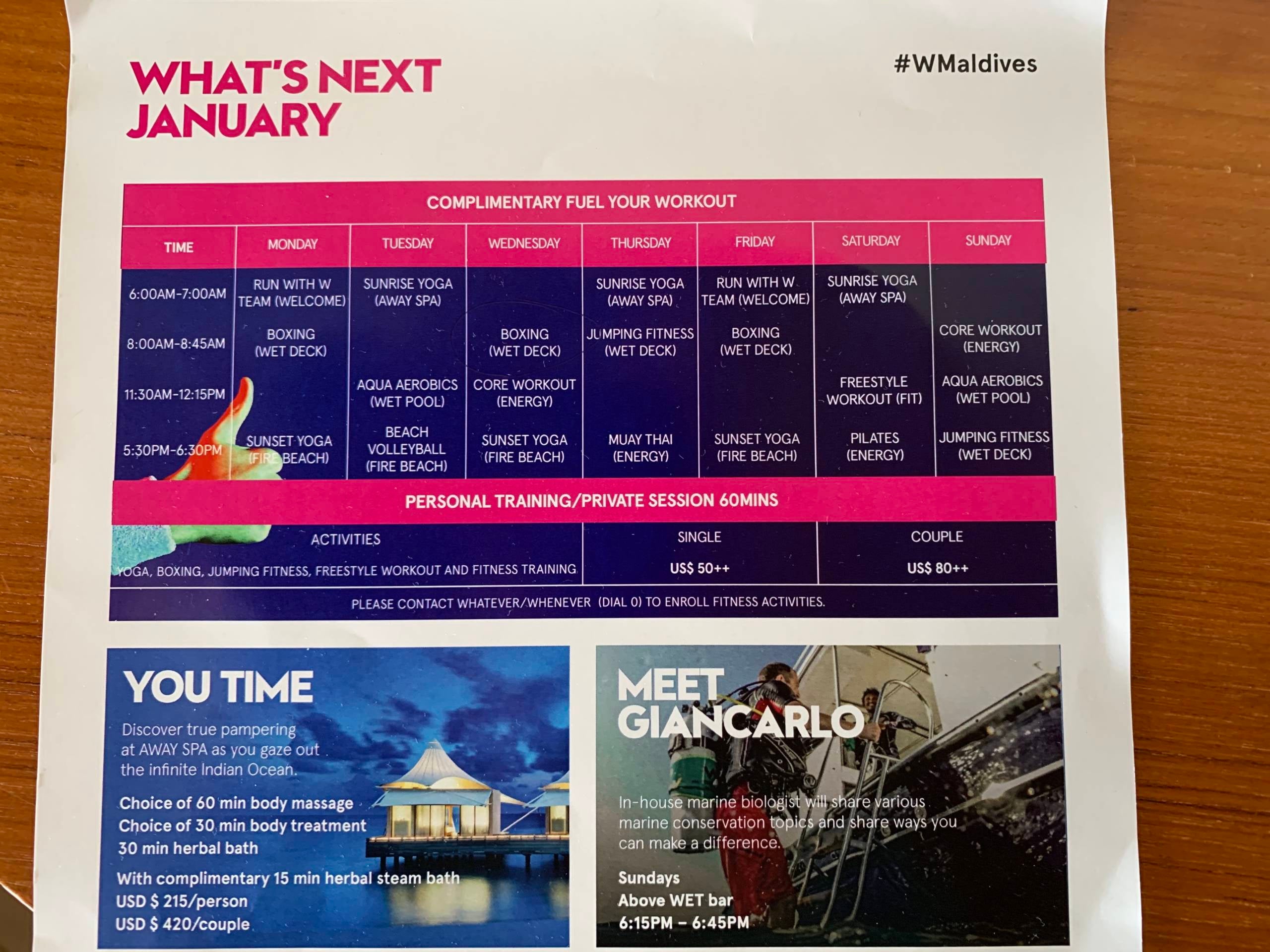 In classic W fashion, that could not have been further from the truth. Waiting in our room upon arrival (I was also given a copy to browse while waiting at the seaplane lounge in Malé) was a weekly activity schedule, which included multiple different fitness classes scattered throughout the week: boxing, muay Thai, pilates, yoga, etc. There was a solid variety to the selection and timing, and I enjoyed boxing in the mornings and even got roped into trying yoga for the first time (I just couldn't say no to the sunset views).