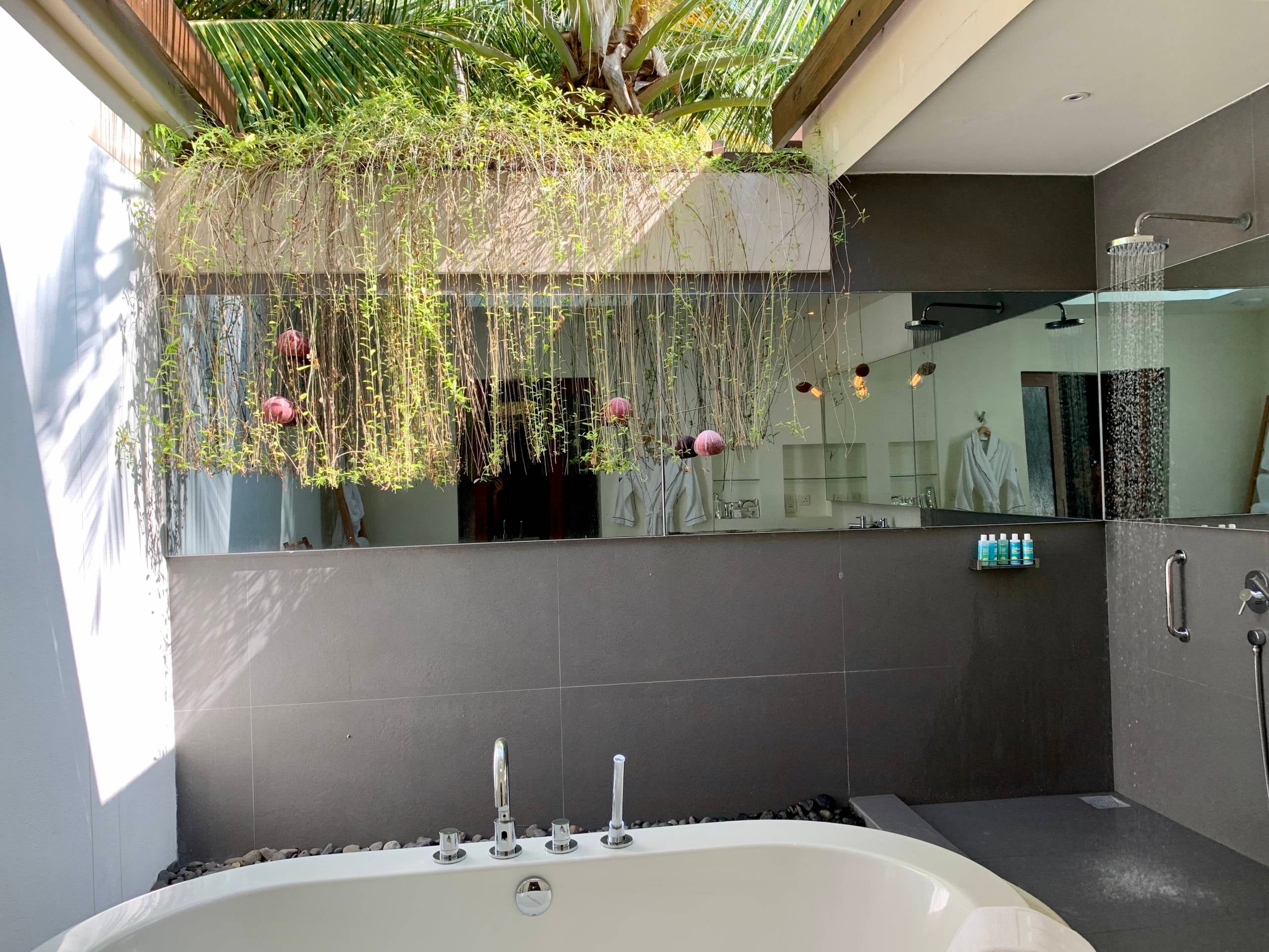 To really drive this point home, if you'd rather stay over land in one of the W's two-story Beach Oases, you'll have to pay extra for that privilege. While that might seem counterintuitive and contrary to everything the Maldives is about, we opted to spend our last two nights in a Beach Oasis and were very happy with that decision. Moving from an overwater villa to a treehouse in the jungle made it feel like we were starting an entirely new trip. We loved some of the more "W" design elements, including the large swinging couch on the upper deck and the outdoor bath and shower.