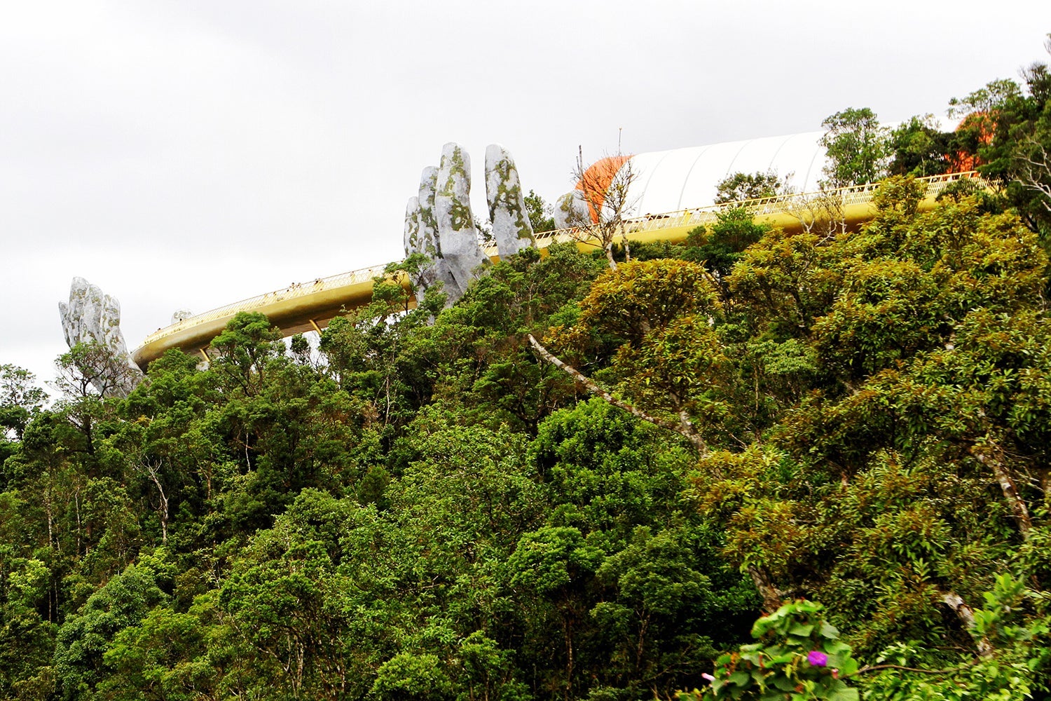 In central Vietnam, not far from Da Nang, travelers have discovered a gleaming gold bridge stretching across the highlands. It's supported by giant concrete hands.