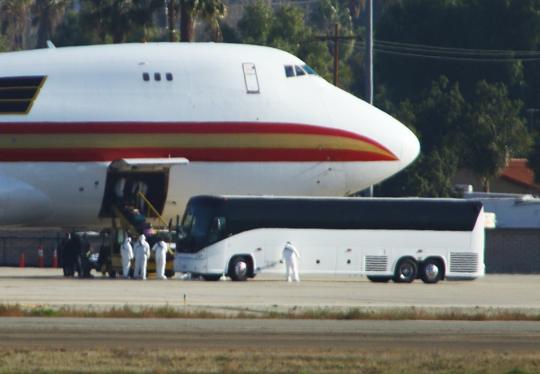 Photographers who saw the 747 land at March said it was met on the tarmac by emergency vehicles and three buses. The Department of Defense said the evacuees will be sent to local hospitals if they are suspected of being infected with the 2019 Novel Coronavirus, which has killed around 170 people and spread around the world since it first emerged in a food market in Wuhan in December. On Thursday, the New York Times reported, authorities found the first case of transmission from person to person in the U.S. The infected person is the husband of a woman who returned from Wuhan, but was not on the evacuation plane.