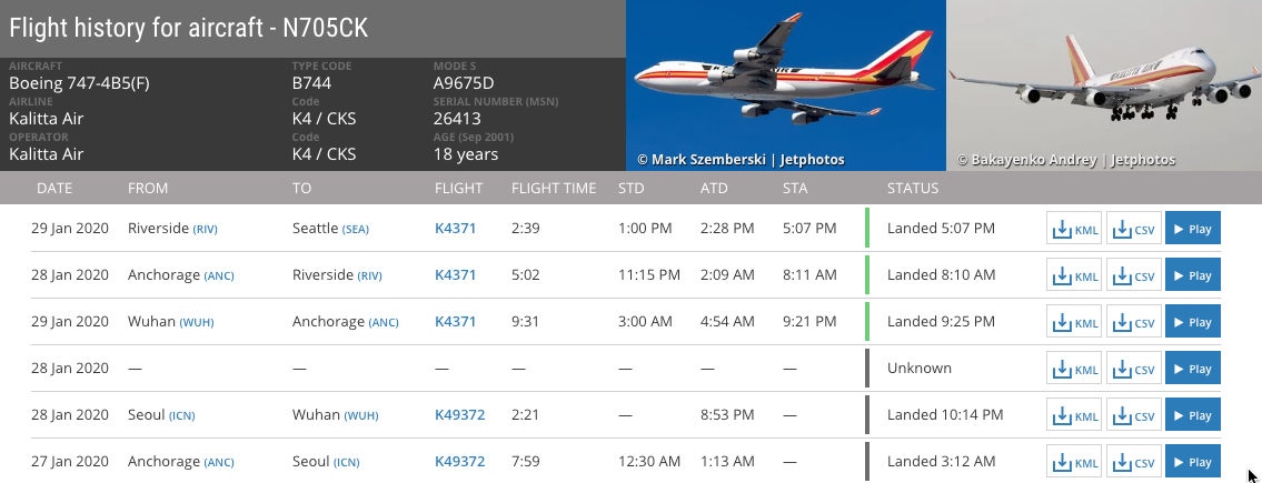 The 747, a 18-year old freighter registered N705CK, stopped in Anchorage to refuel on the way from Wuhan to March Air Reserve Base, near Riverside, California. Dr. Anne Zink, Alaska's chief medical officer, said at a news conference on Wednesday, after the plane had left Alaska, that the plane was able to carry 240 people but only held 201.
