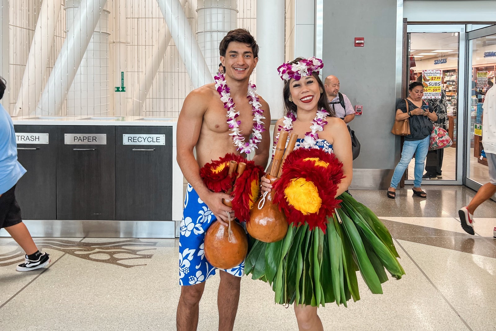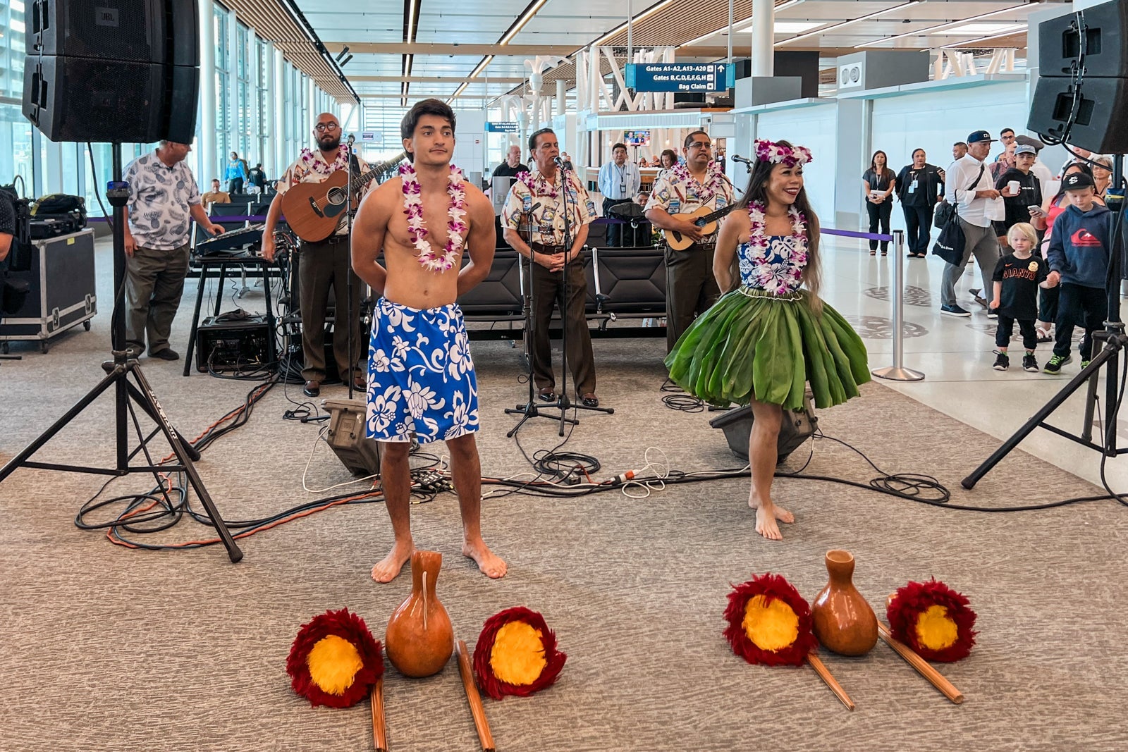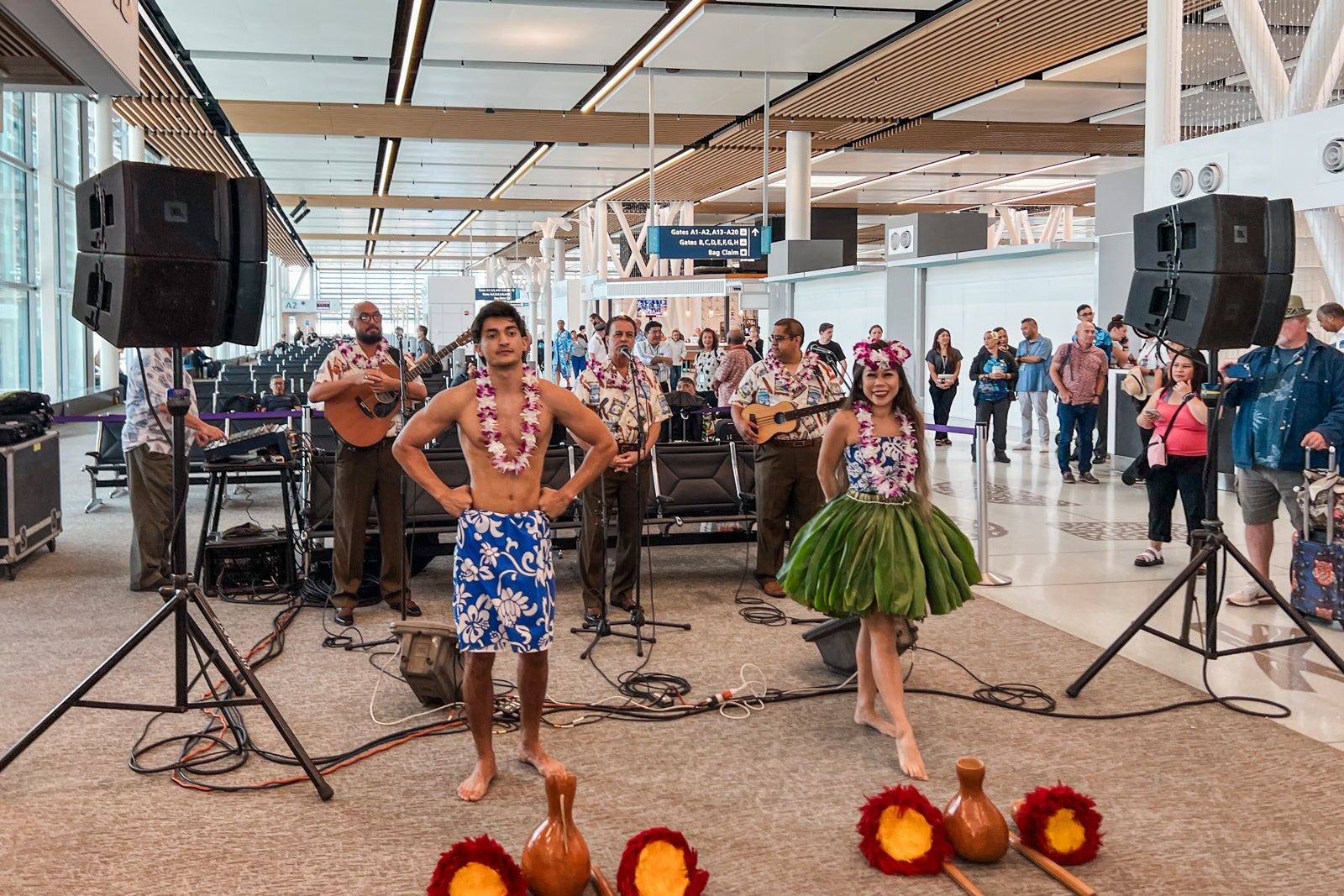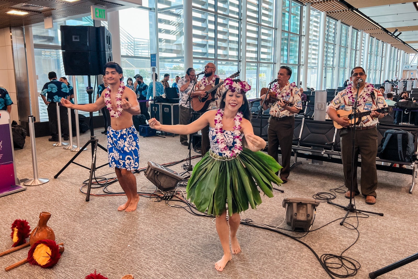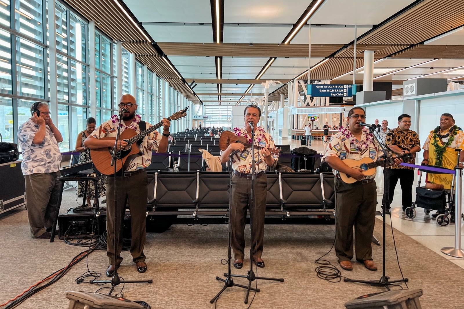 At the gate, the Hawaiian Airlines Serenaders sang and played instruments for about half an hour before boarding ceremonies fully kicked off.
