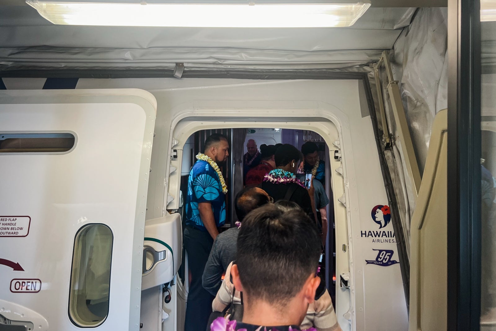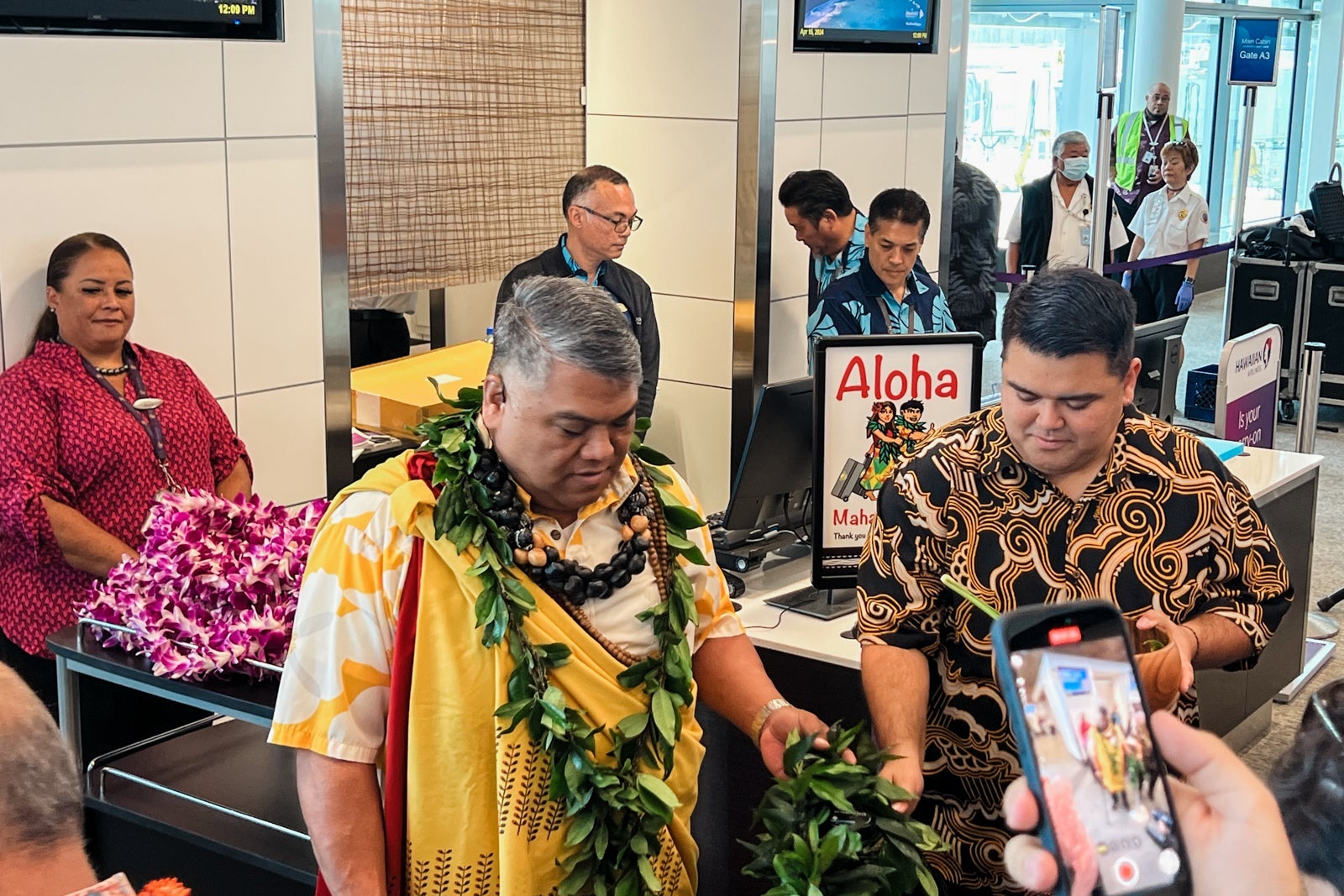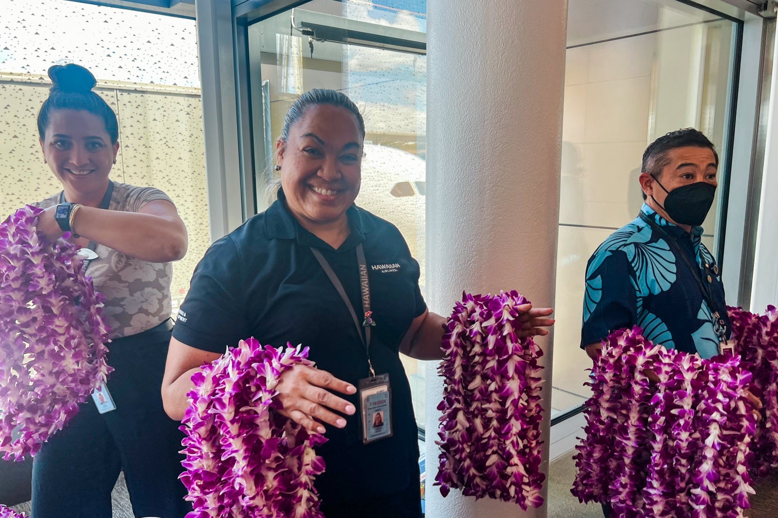 As passengers moved toward the boarding doors, Hawaiian employees greeted every passenger with "Aloha," before placing a lei around each person's neck.