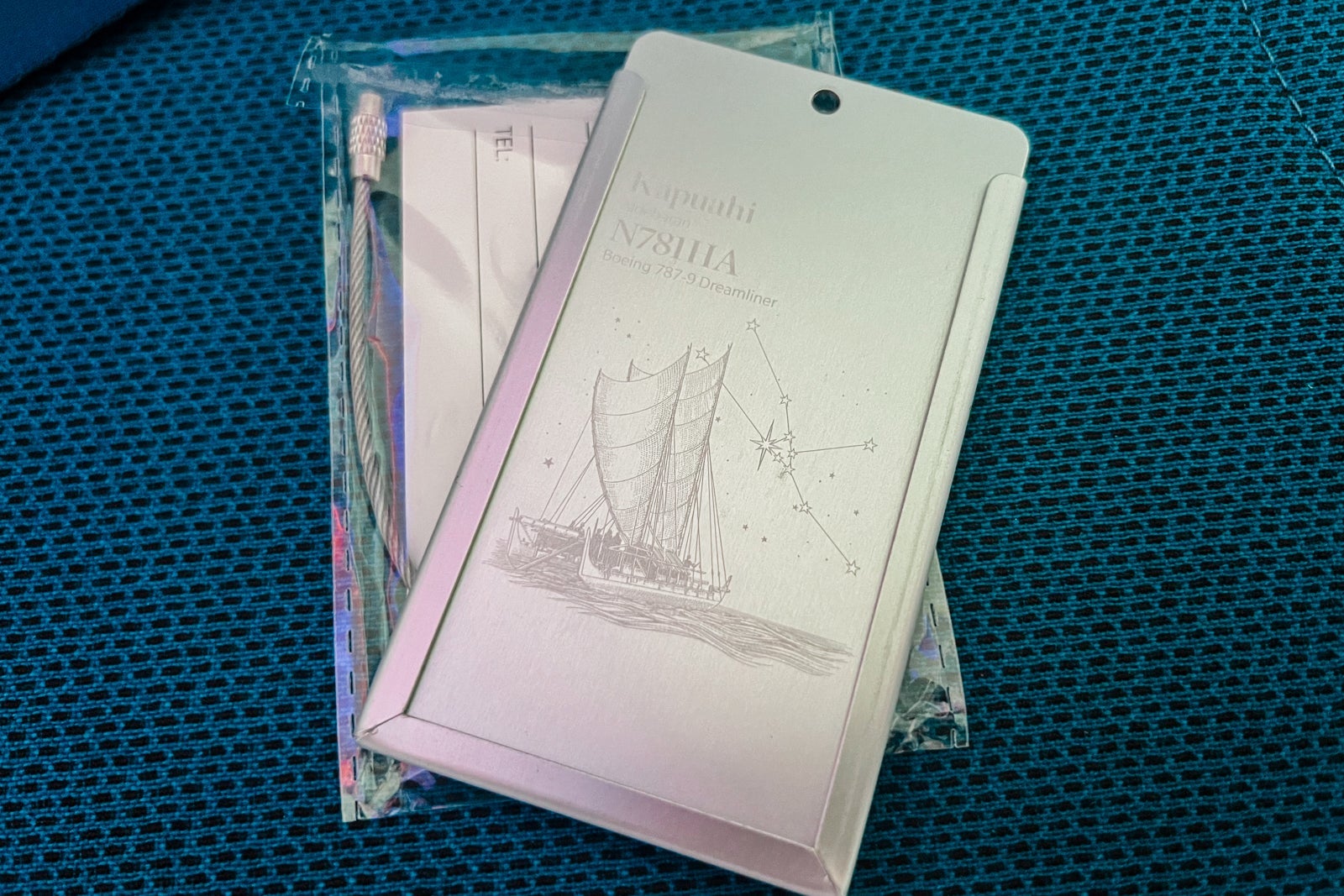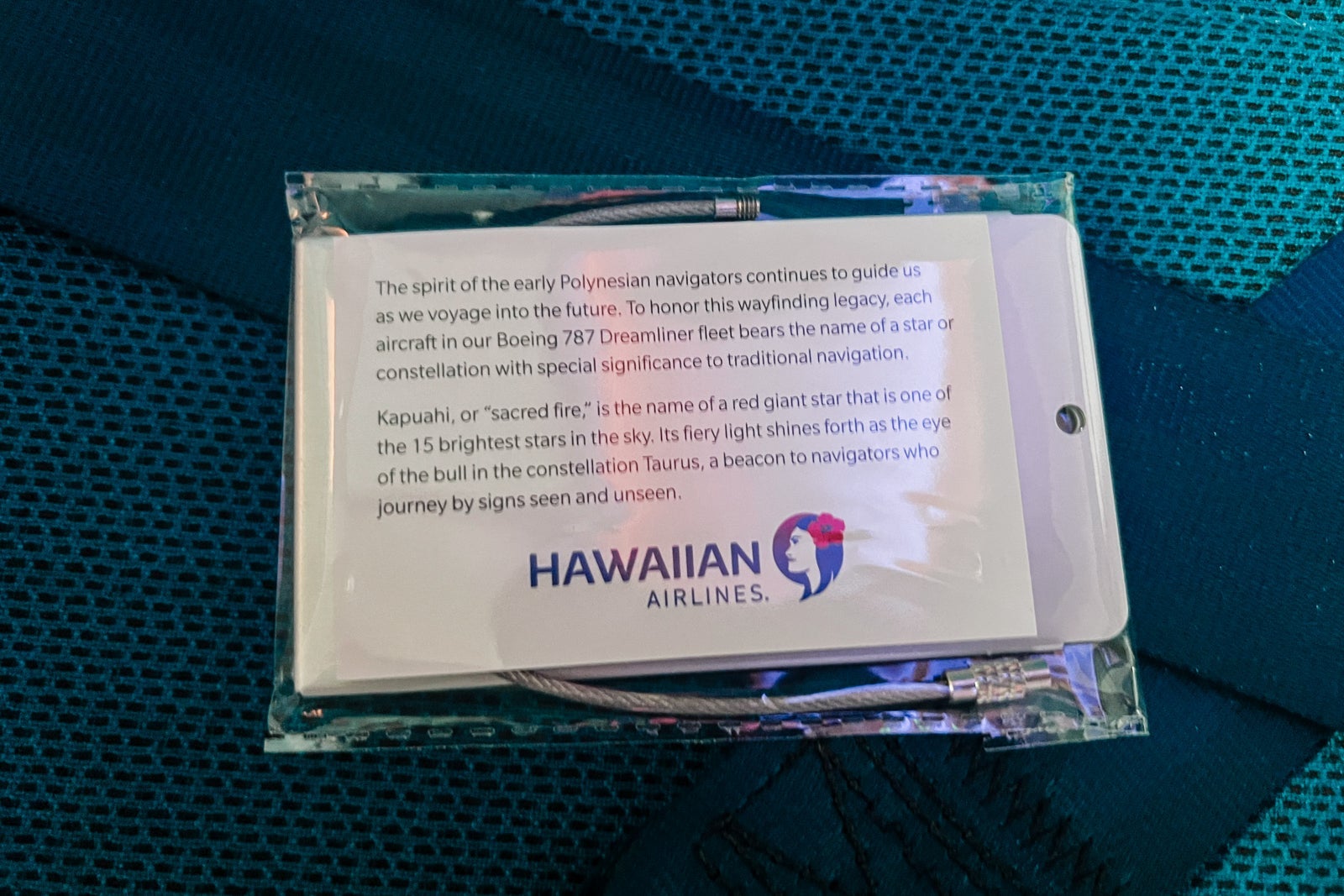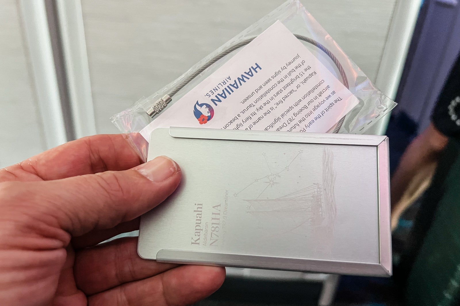 All passengers were handed a commemorative bag tag honoring the inaugural Dreamliner flight. The metal tag had a note from Hawaiian explaining the significance of our Dreamliner: "Kapuahi, or 'sacred fire,' is the name of a red giant star that is one of the 15 brightest stars in the sky. Its fiery light shines forth as the eye of the bull in the constellation Taurus, a beacon to navigators who journey by signs seen and unseen."
