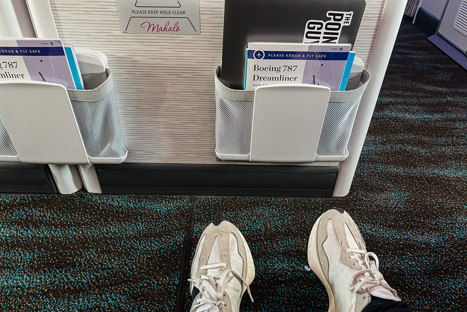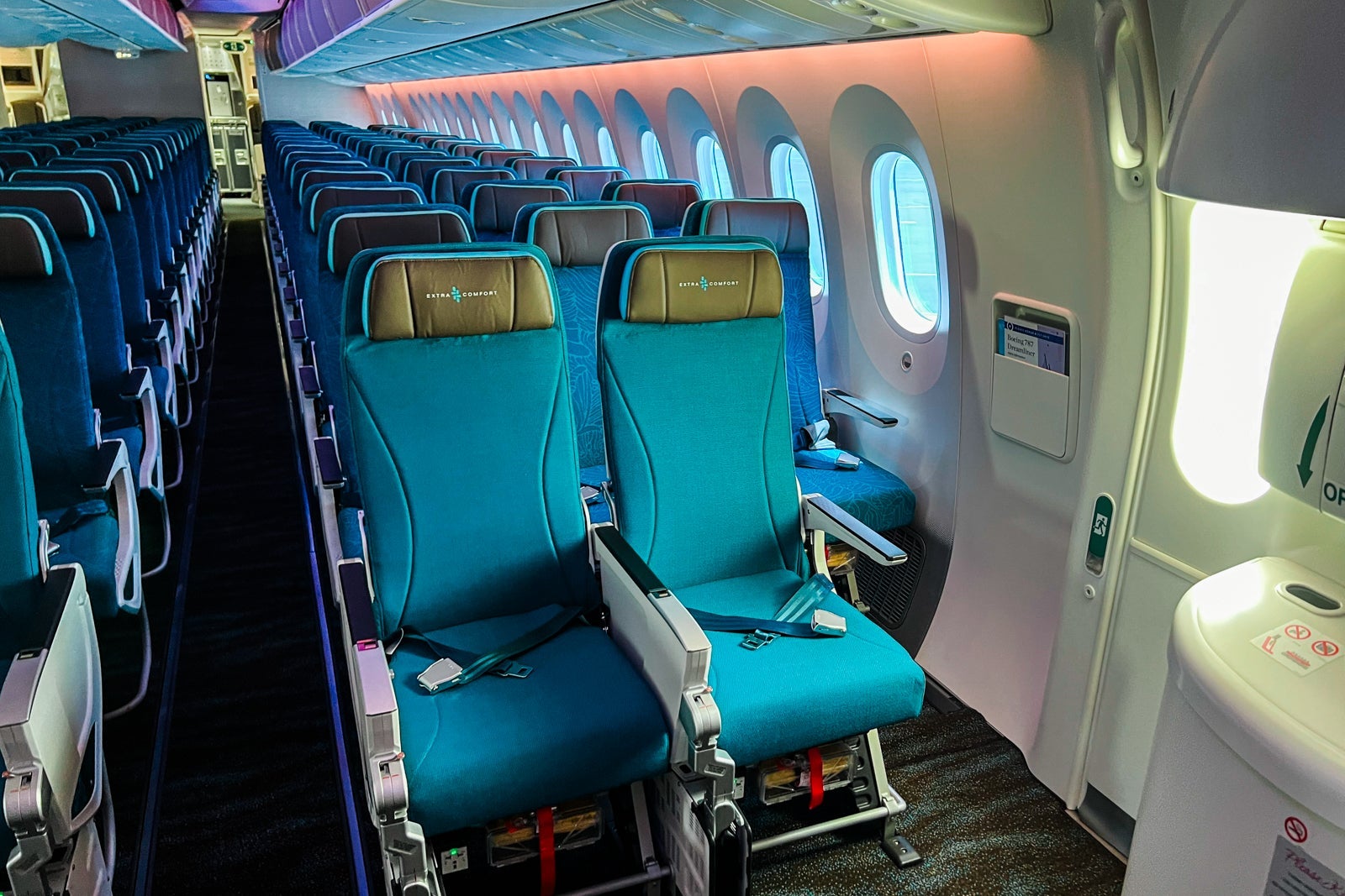 I was assigned seat 33F, one of the 79 seats on this plane that are sold as Extra Comfort seats. When I checked in on the Hawaiian Airlines app, there were few seats left to choose from (aside from a few middle seats in the first section of the main cabin for an extra $4). I stuck with my bulkhead seat in the first row of the second cabin in the back.