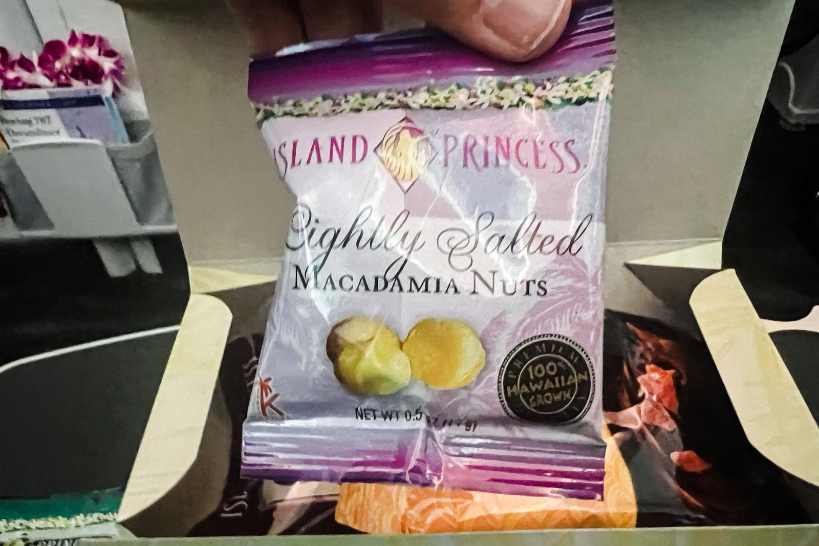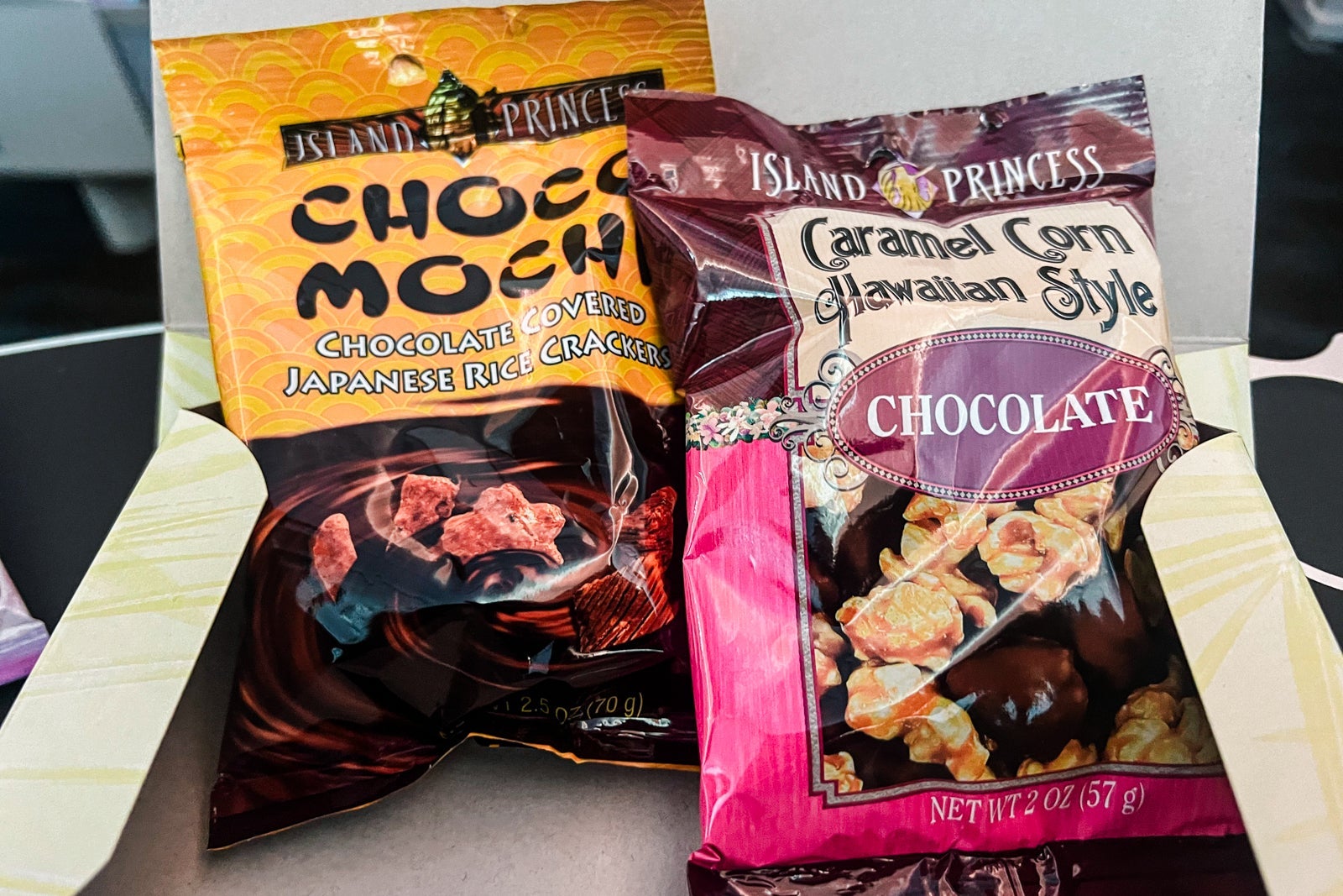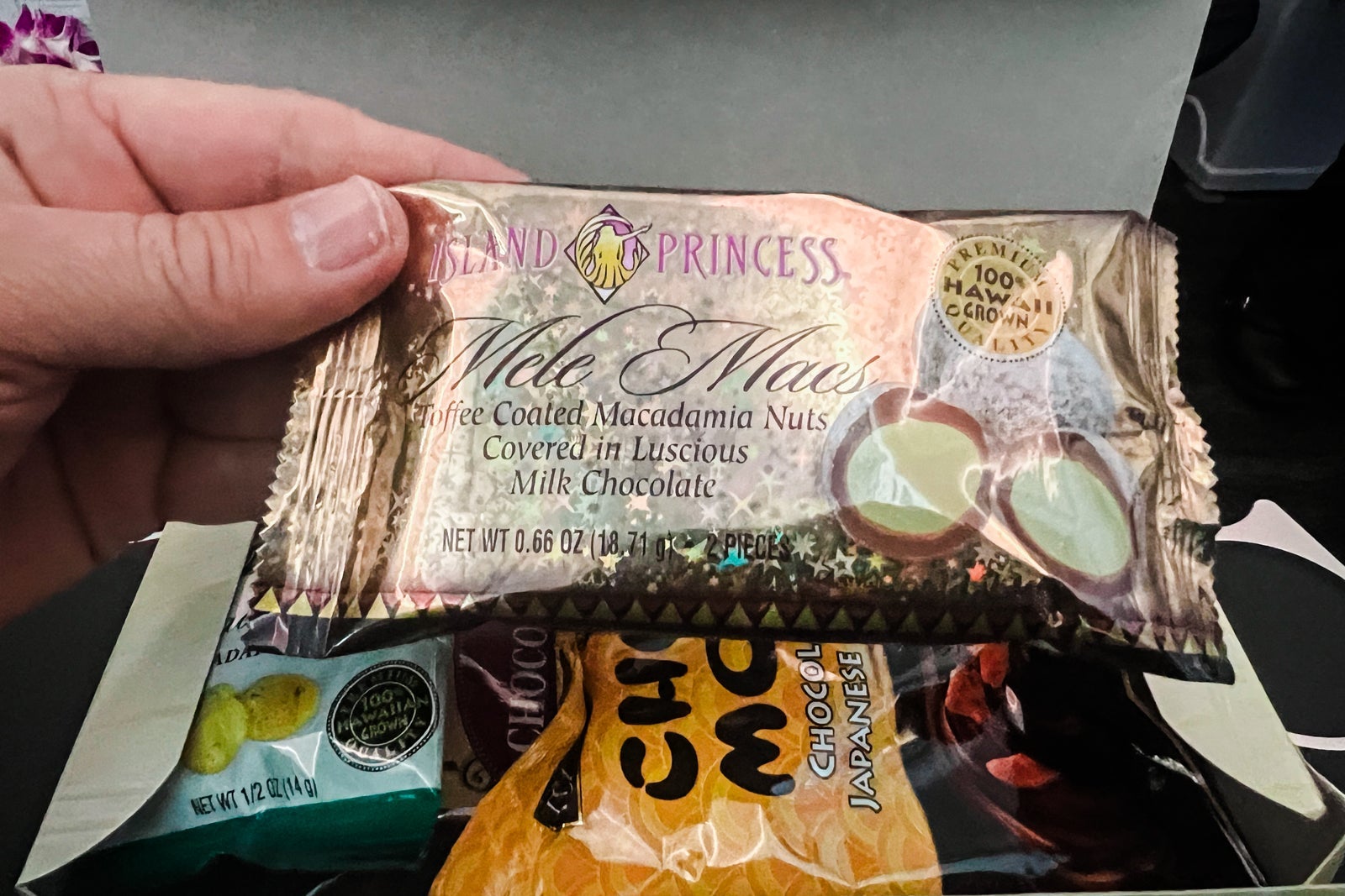 I bought the "Made in Hawaii" snack sampler for $10.50. It included chocolate Carmel popcorn, Choco Mochi and two types of packaged macadamia nuts, among other treats. I used my Hawaiian Airlines® World Elite Mastercard®, and of course there was a credit card offer onboard as well for up to 65,000 Hawaiian Airlines miles. Too bad I already have the personal and business versions. The information for the Hawaiian Airline World Elite Mastercard has been collected independently by The Points Guy. The card details on this page have not been reviewed or provided by the card issuer.