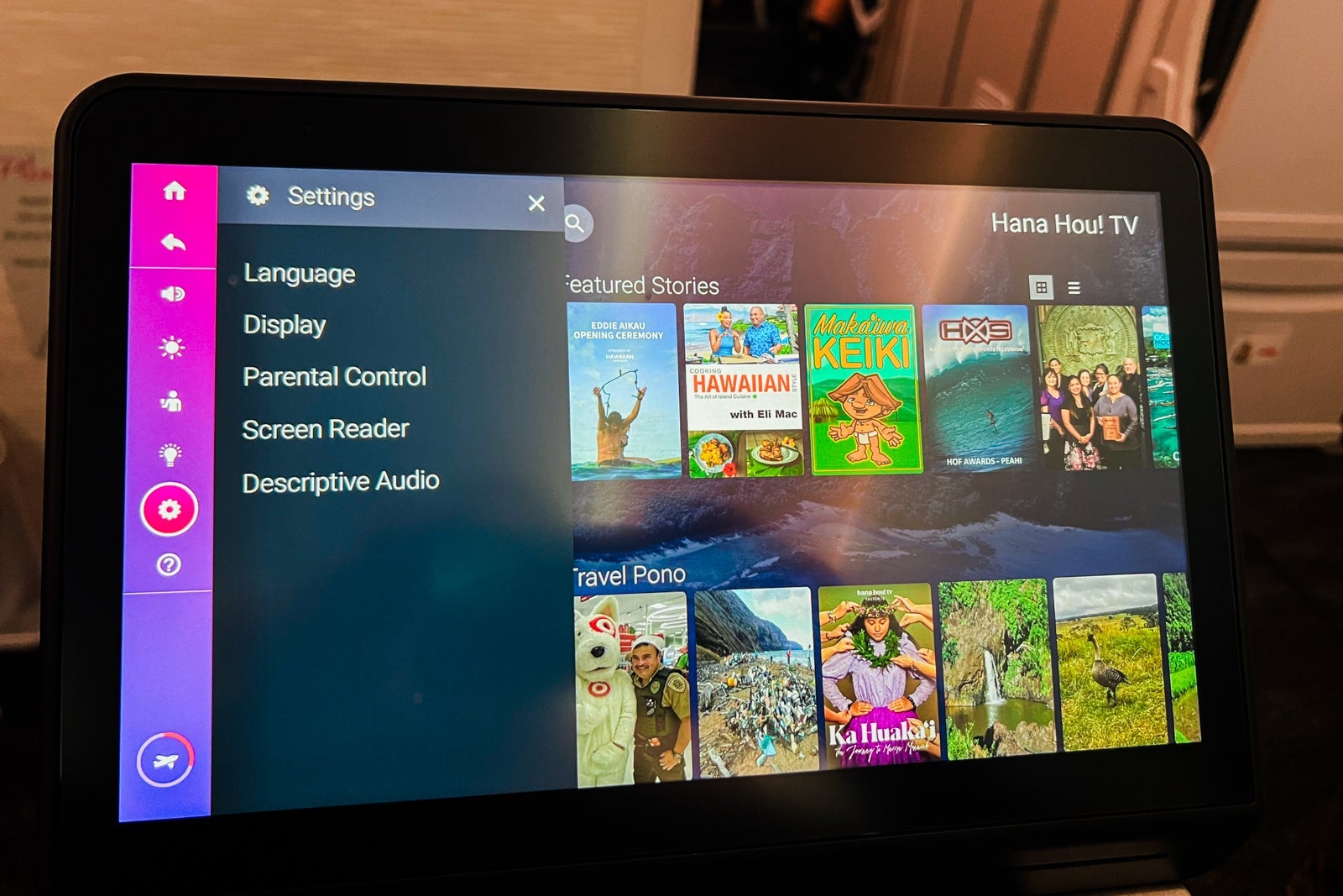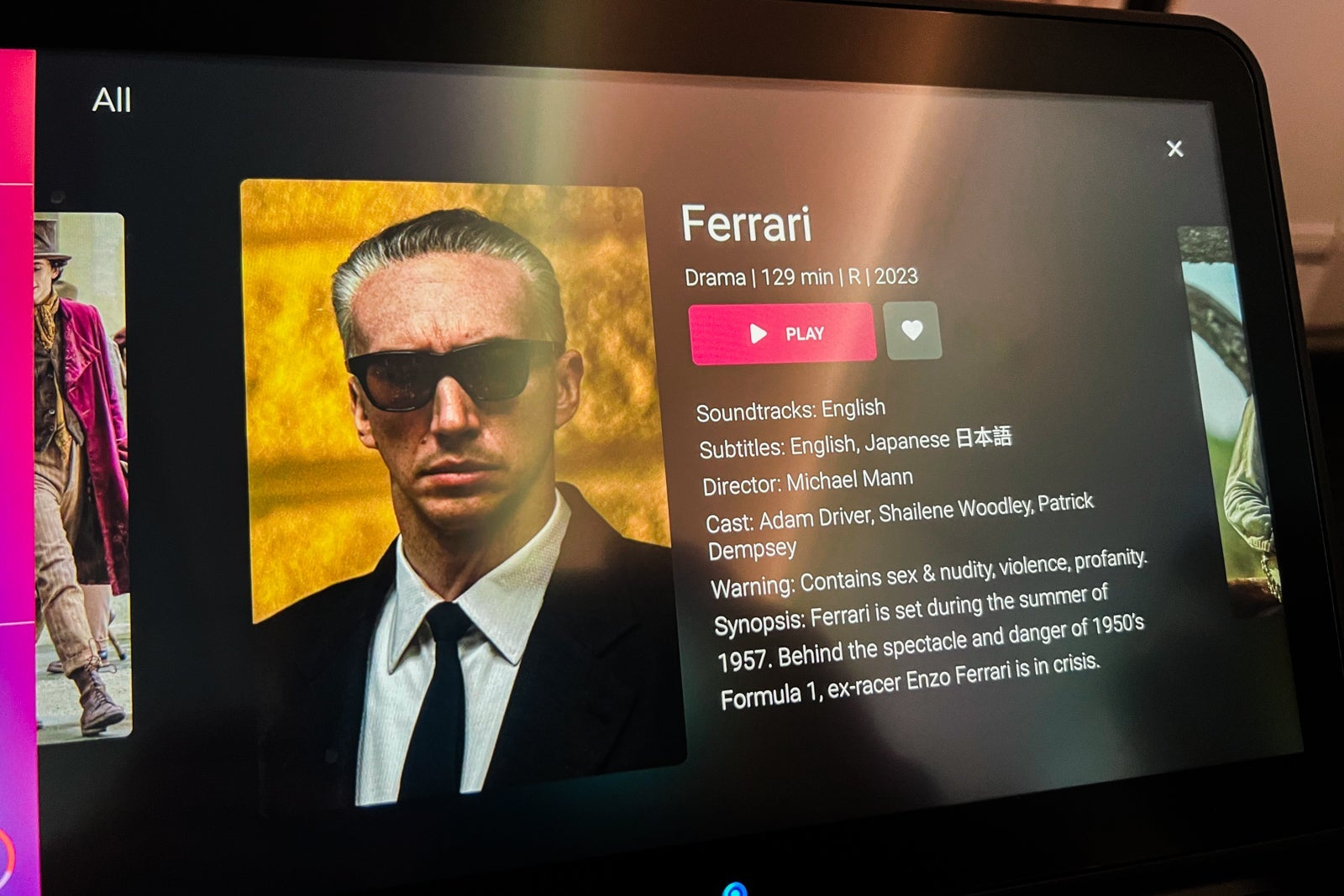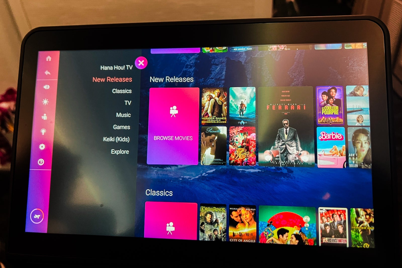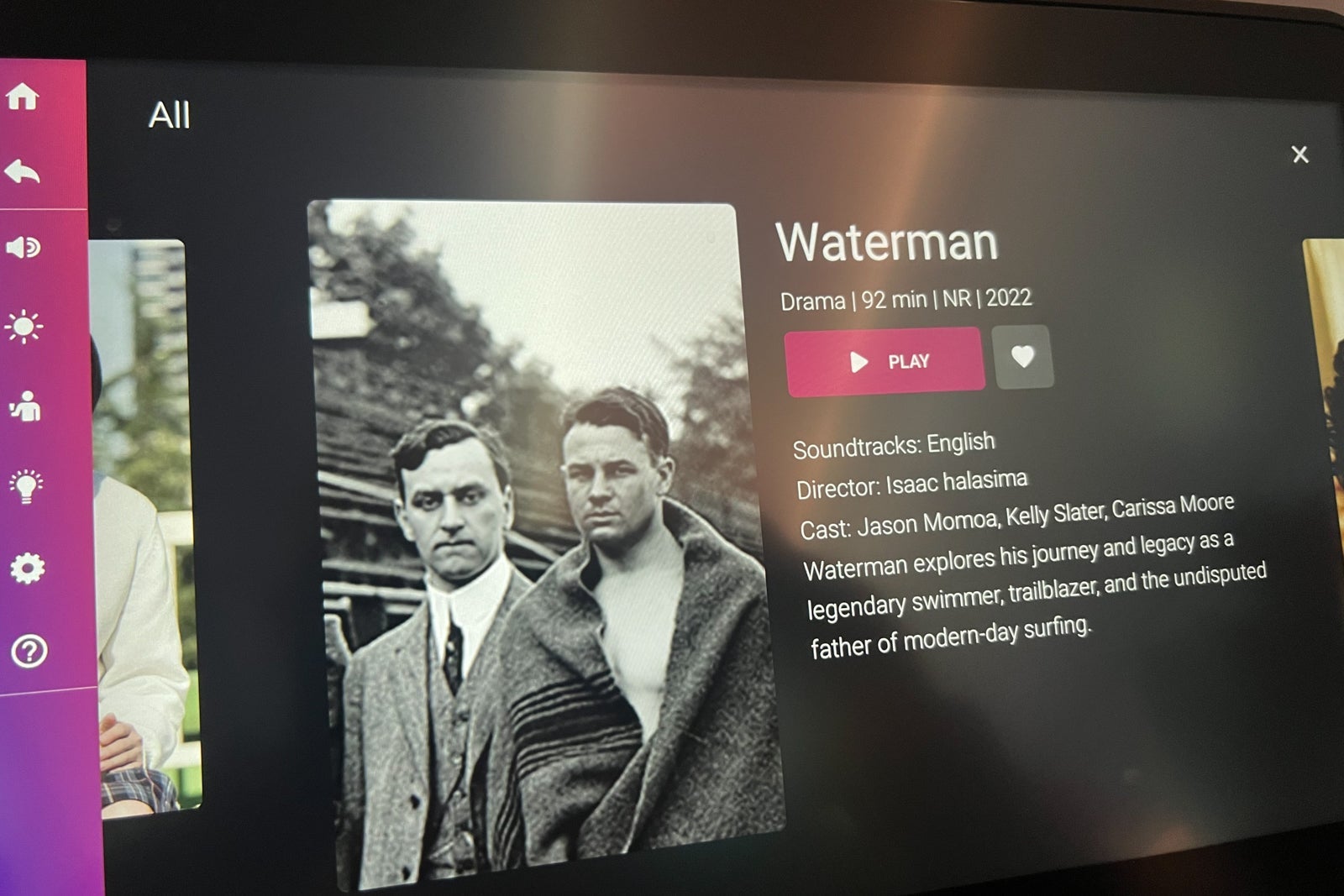 A large selection of new-release movies was available for viewing, including "Barbie," "Ferrari" and "Past Lives," as well as several Japanese and Korean films. I ended up watching a fascinating documentary called "Waterman" about the famed Olympic swimmer and native Hawaiian Duke Kahanamoku.