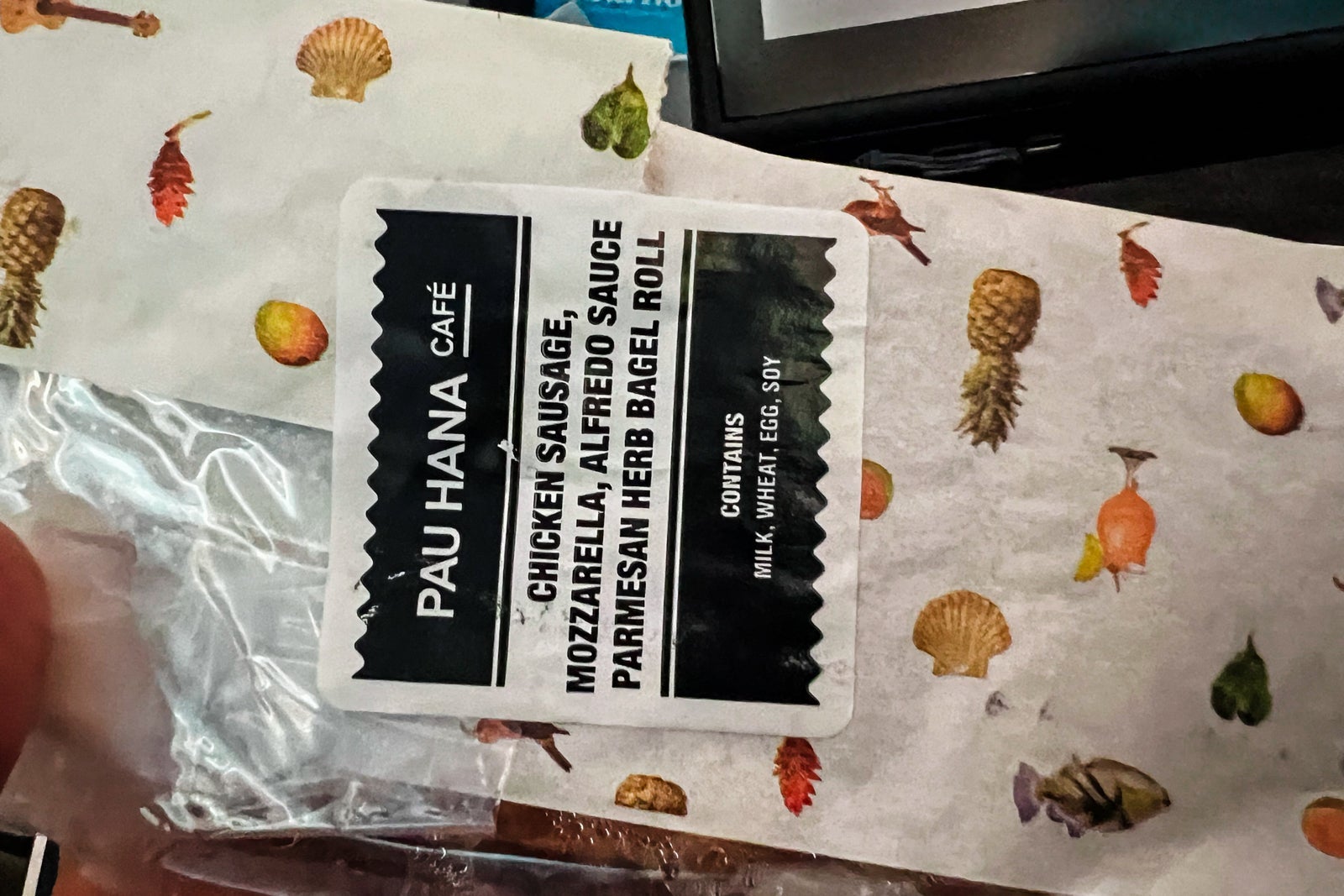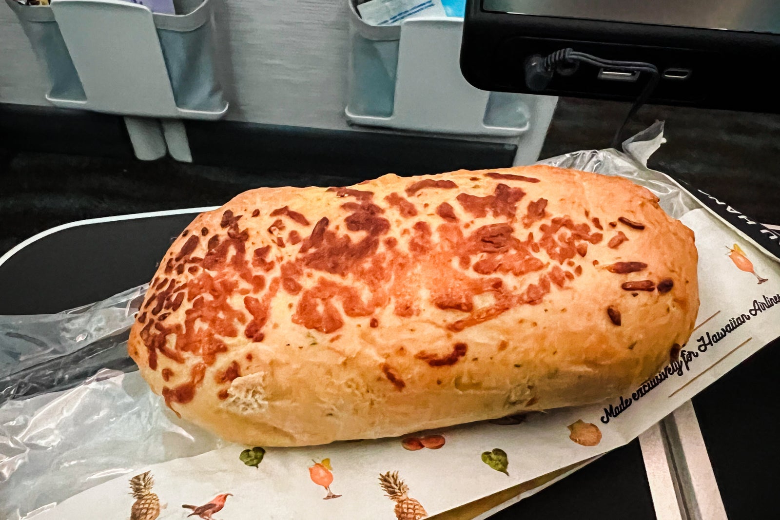 After some noticeable clear-air turbulence, which the 787 handled beautifully, flight attendants served a light snack (for free). All passengers got a chicken sausage, mozzarella, Alfredo sauce, and Parmesan herb bagel roll. It was more like a delicious hot pocket, but it hit the spot. Of course, I had to try some delicious POG juice (passionfruit, orange and guava juice.) Passengers also got to choose from a selection of free beverages, including Coke products. As a special treat, flight attendants also gave out Kohana Mai Tai cocktails to those who wanted one. They normally sell those onboard for $8 bucks.