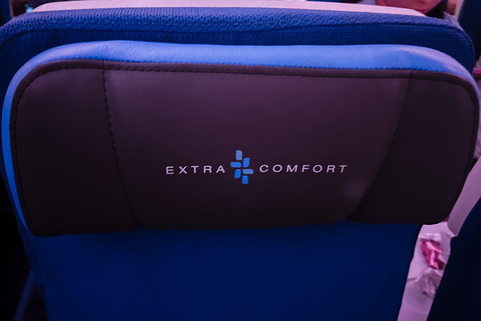 Extra comfort seats have four additional inches of pitch, more legroom and AC outlets. Indeed, my seat in the aisle bulkhead in the middle three seats had a whopping 56 inches of pitch when I measured from the back of the seat to the bulkhead.