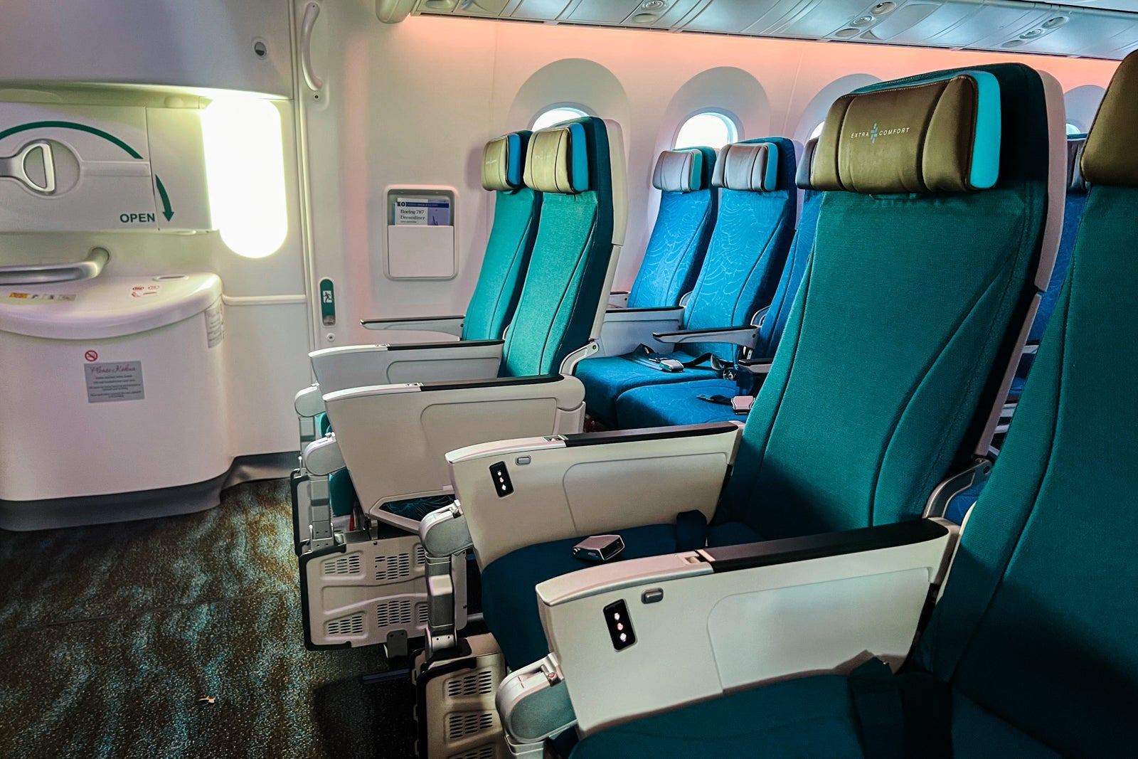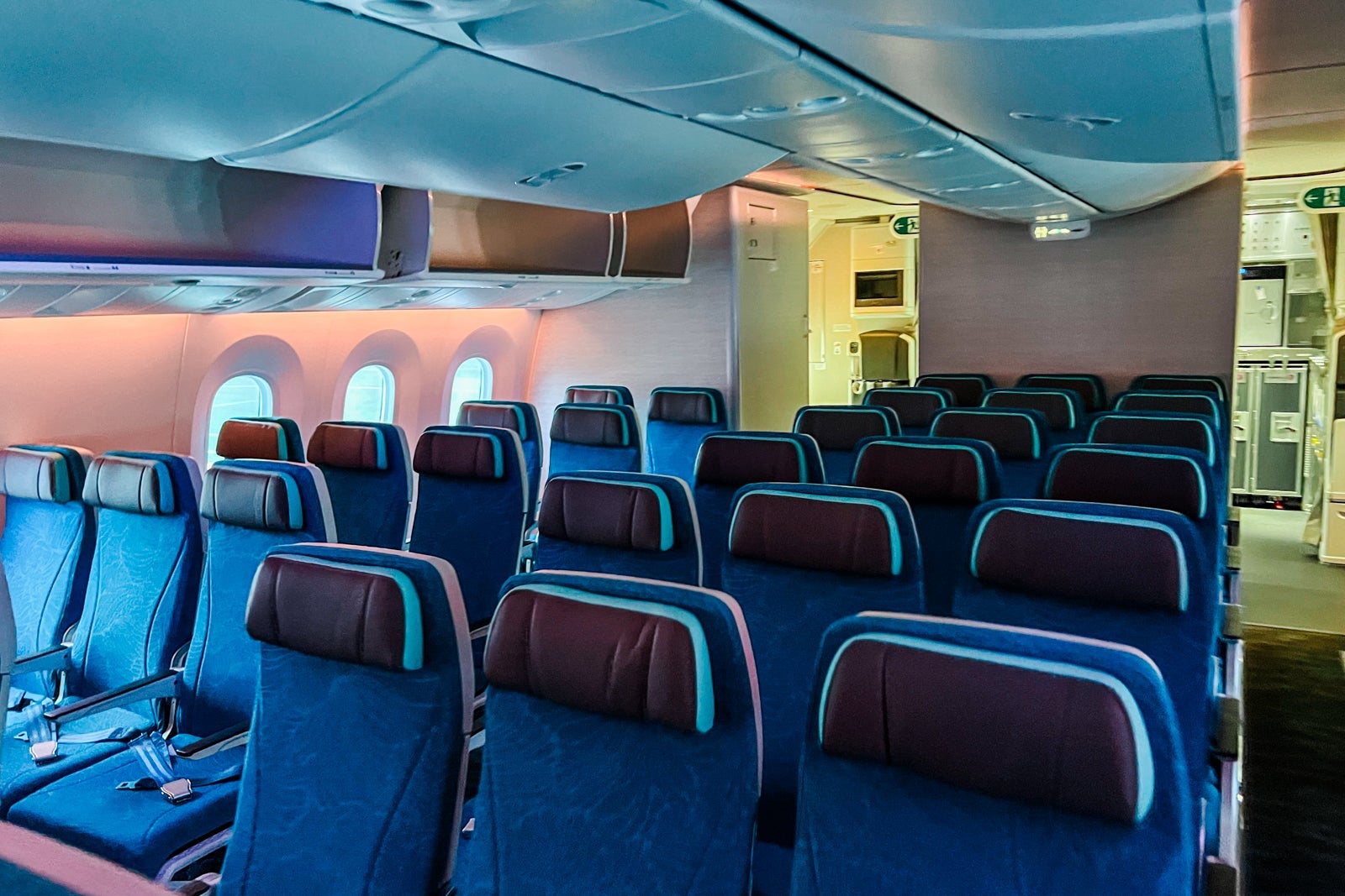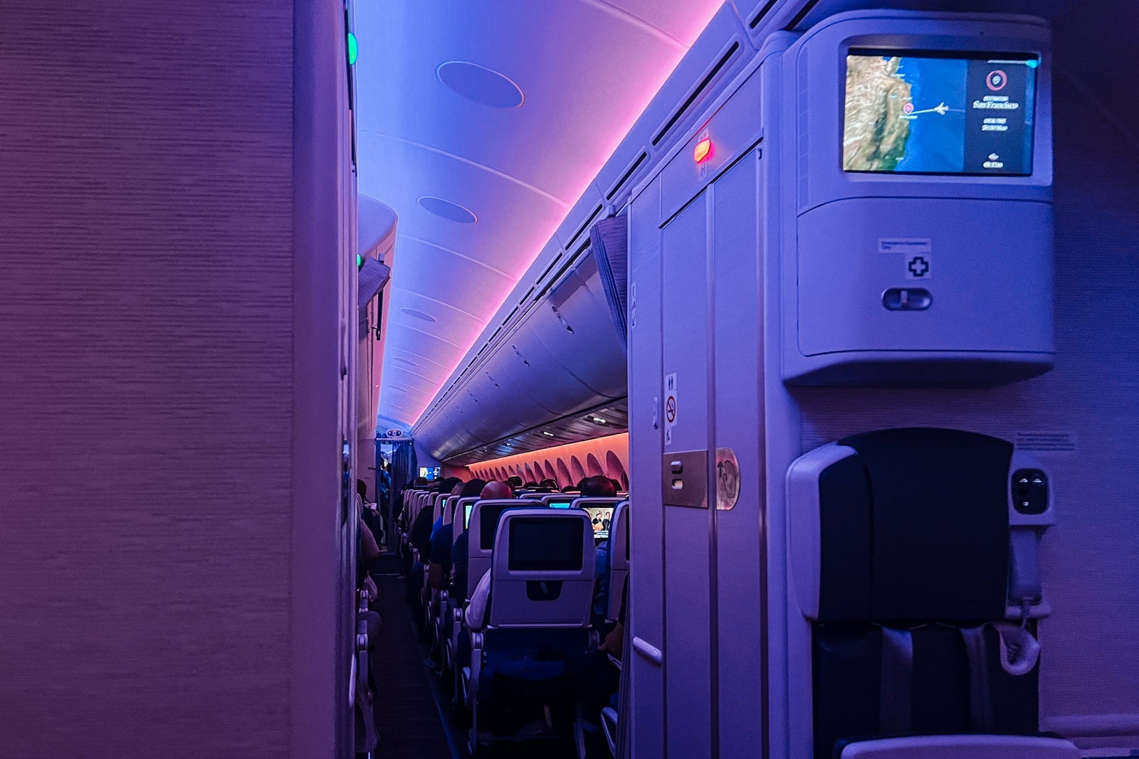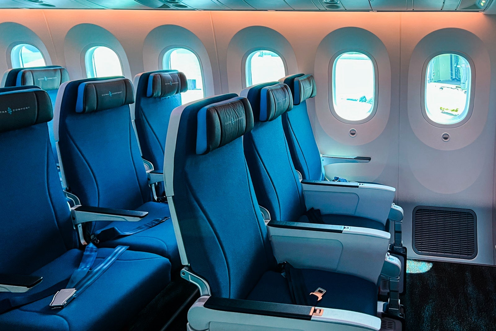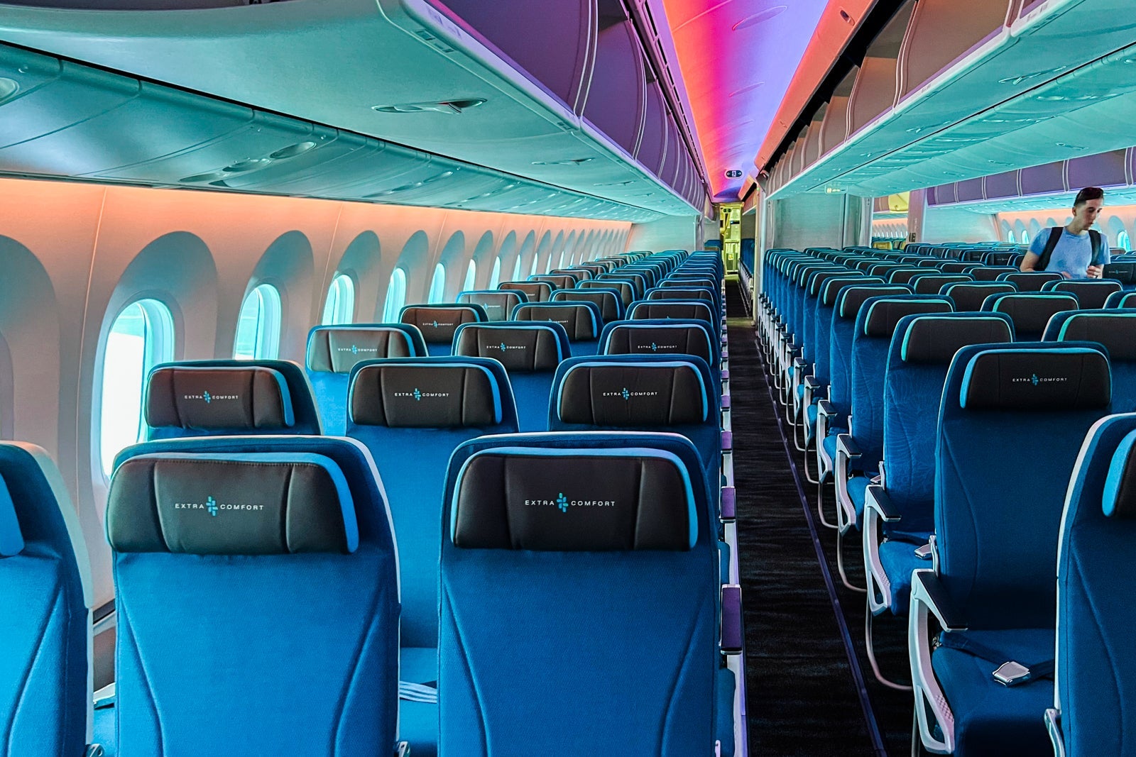 I wasn't lucky enough to snag a seat in the all-new business class cabin: It was completely sold out. However, I was excited just to be on a brand-new plane for this inaugural. In any case, the coach cabin was beautiful, too, with 266 Collins Aerospace Aspire seats.