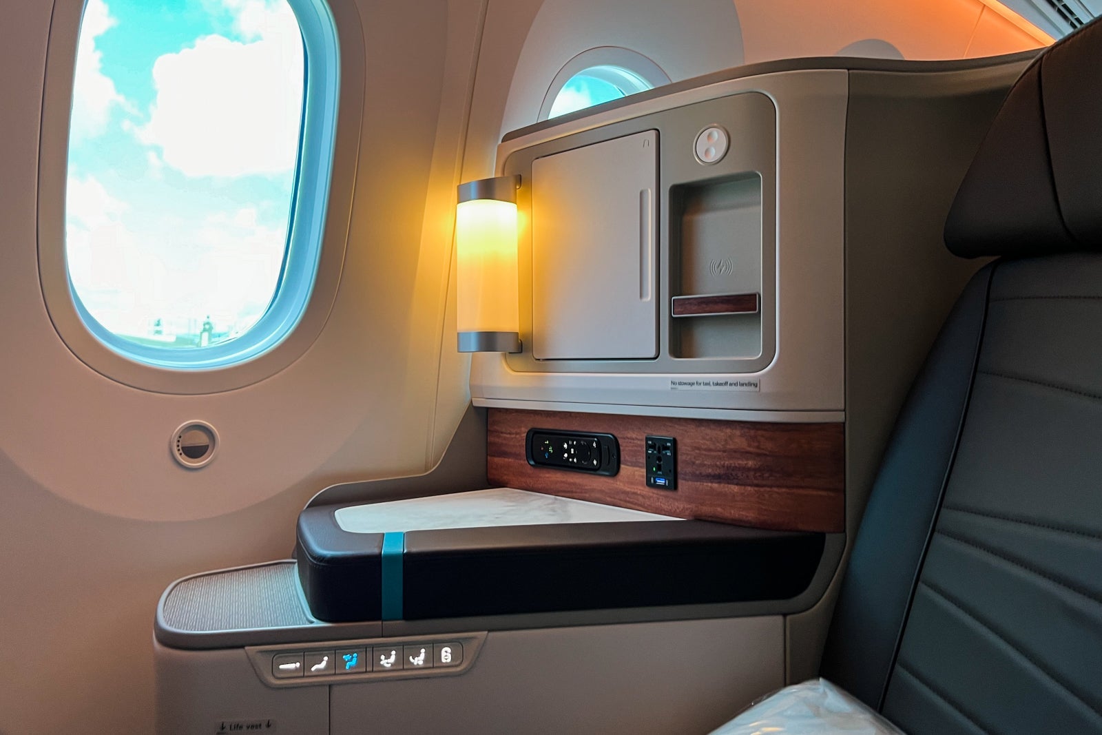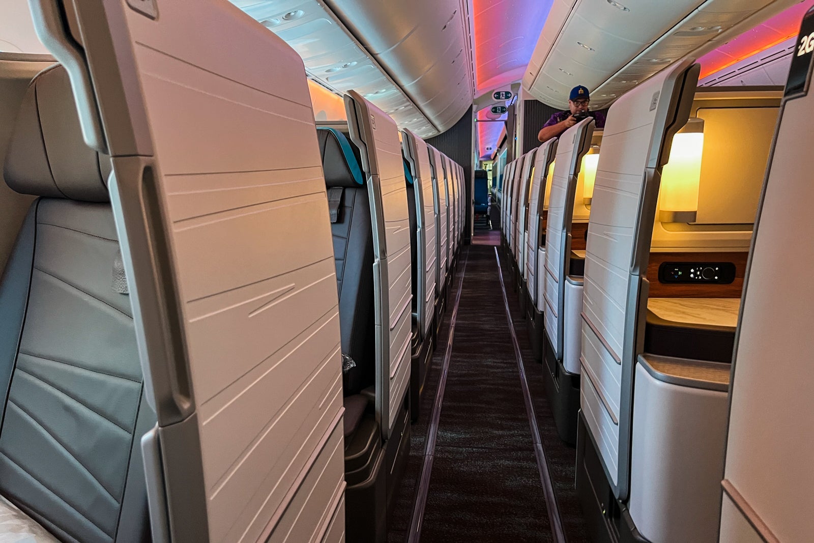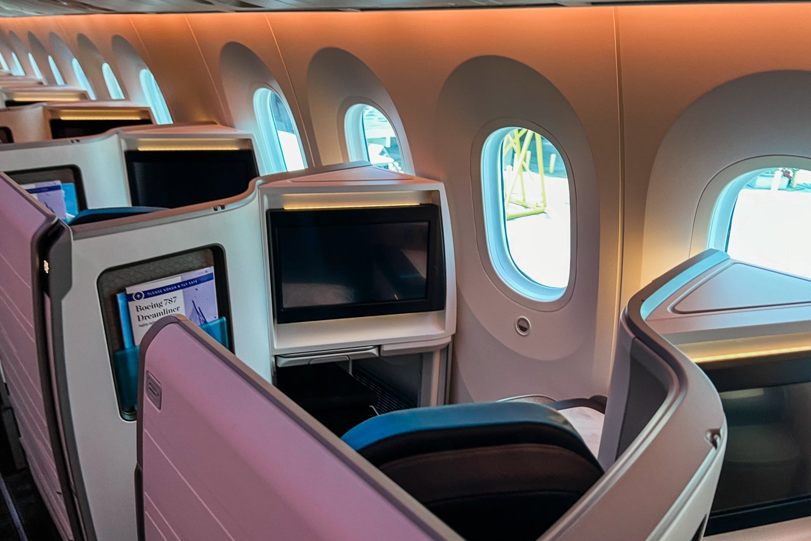 The twin-aisle Dreamliners have 34 business-class suites in a 1-2-1 configuration spread across seven rows. Business class features an all-new, suite-style Adient Aerospace Ascent seats that can also be found on some Qatar Airways' jets. Hawaiian gave me a quick look before boarding.