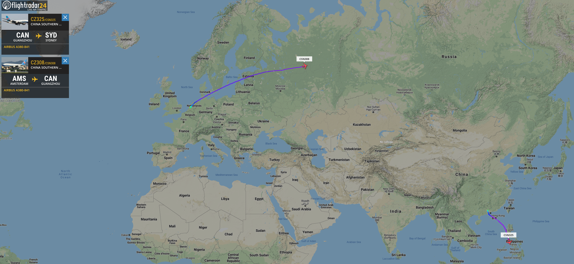 A map from flight-tracking site Flightradar24 showed that on Friday morning, two China Southern flights were the only A380s airborne in the entire world. One was over Russia on the way home from Amsterdam; the other over the Philippines, headed to Australia.