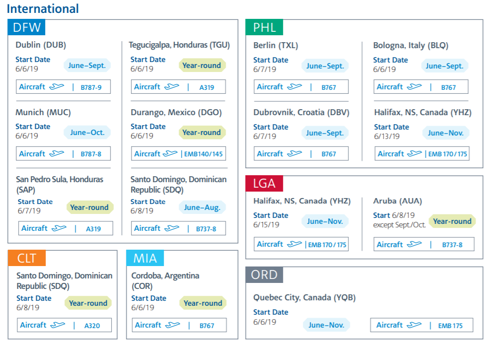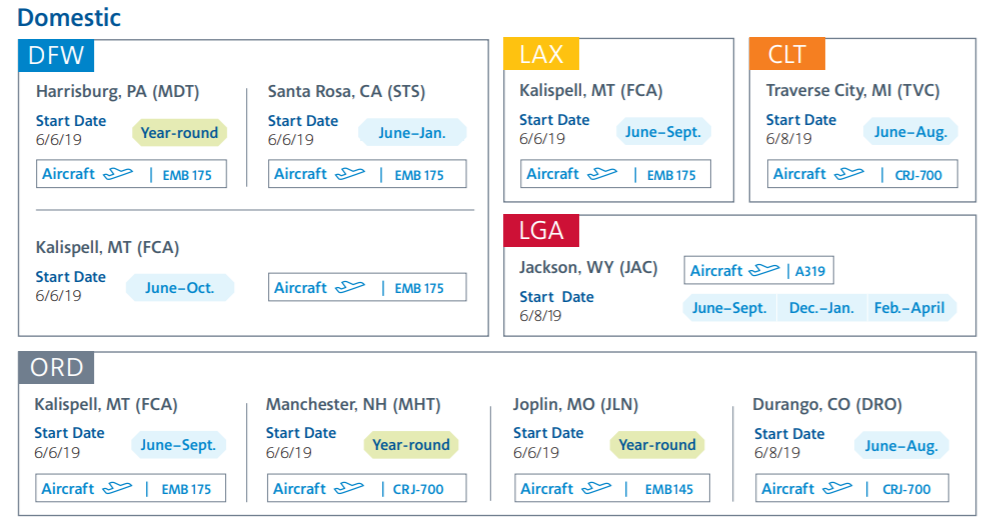 Domestically, AA is adding 10 new routes on June 6 and 8. Three of these routes are summer service between AA's hubs in Chicago (ORD), Dallas/Fort Worth (DFW) and Los Angeles (LAX) and Kalispell, Montana (FCA).