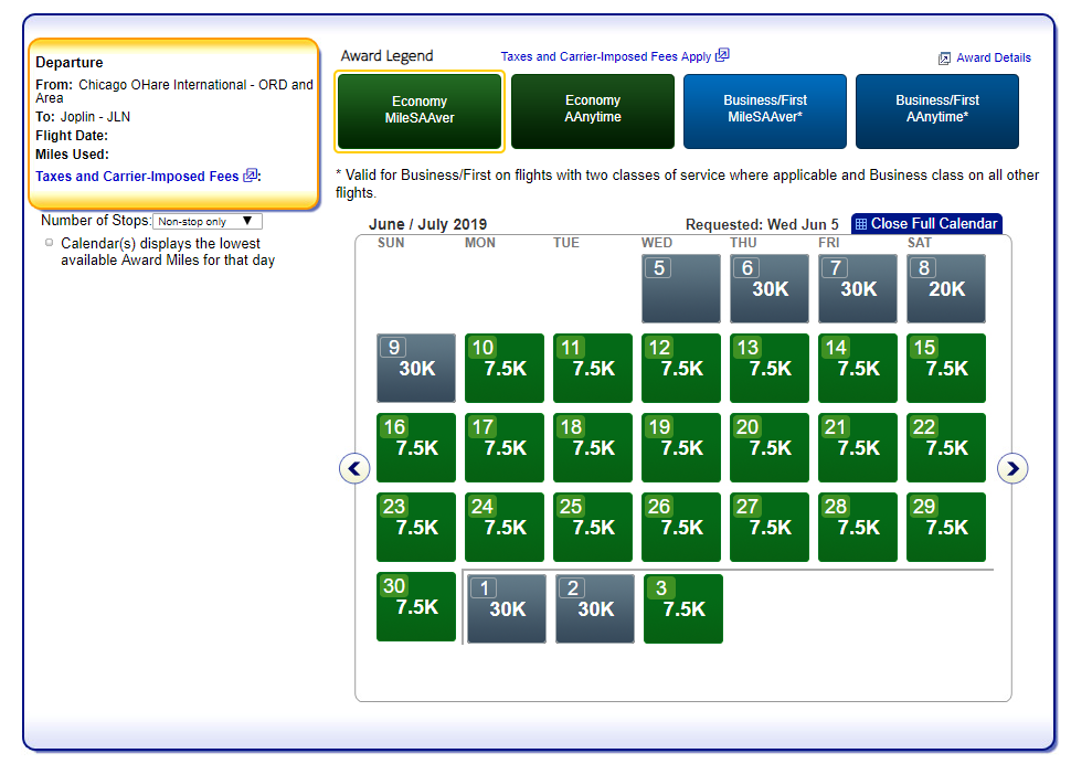 As the Chicago-Joplin route is under 500 direct flight miles, awards on these flights start at 7,500 AAdvantage miles each way. There's pretty good availability currently on this route: