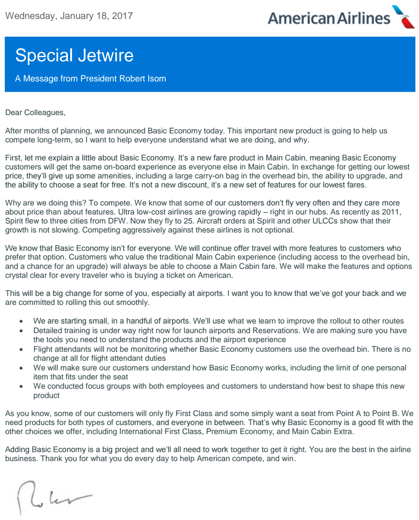 Here's a letter from AA's president detailing the latest airline change: