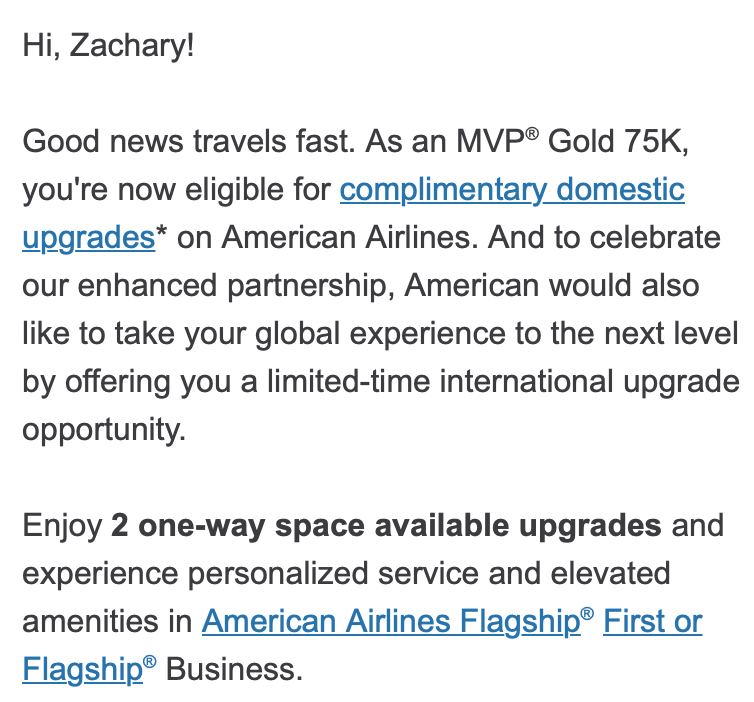 I earned MVP Gold 75K as part of the airline's status match last month, and today received an email offering two one-way "space available" upgrades on a handful of long-haul American Airlines flights.