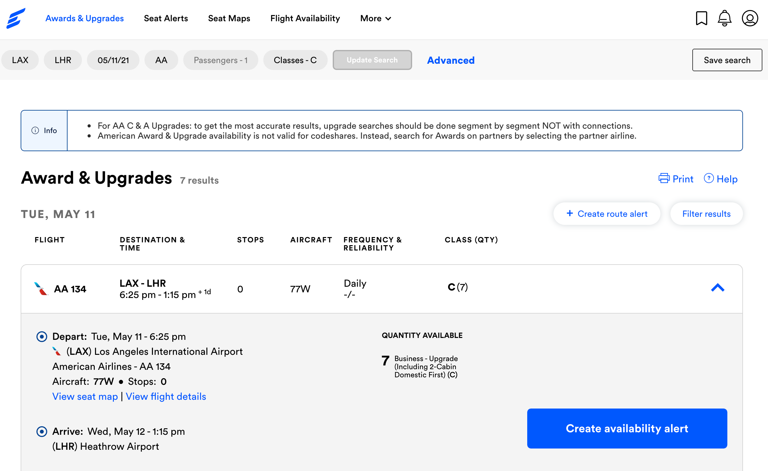 Note that you'll need to specifically search using the "Award & Upgrade" tool — "C" class may appear with the "Flight Availability" option, but that doesn't necessarily mean an upgrade is available to confirm.