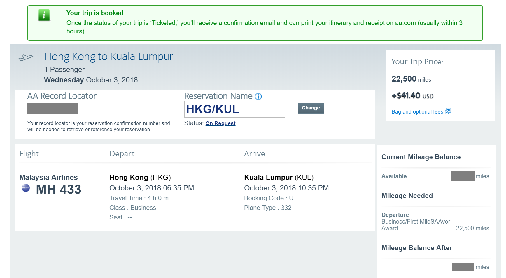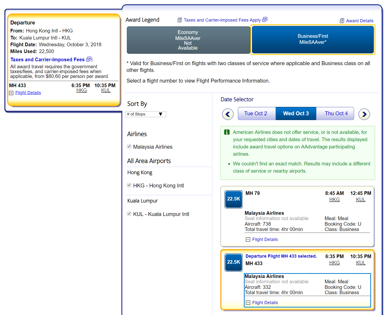After reading our review of Malaysia Airlines A330 business class, that option looks pretty sweet, so I went ahead and completed the booking on that flight. It went through without a hitch. (Plus, as an AA Executive Platinum, I can always cancel this award for free later)