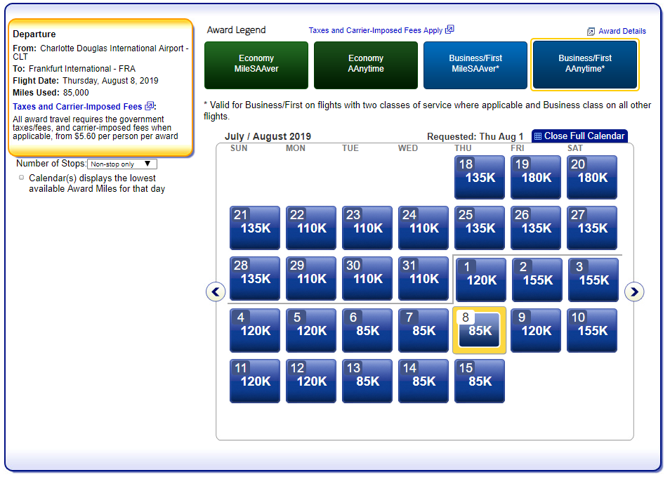 At current TPG valuations, 85,000 miles is valued around $1,190 -- which isn't too bad for a business class flight to Europe during peak summer. Plus, you'll actually be able to book on AA aircraft that don't tack on fuel surcharges. Usually you can find saver award space to Europe on British Airways when searching through AA, but you'll have to shell out hundreds of dollars extra on top of the miles for those flights.